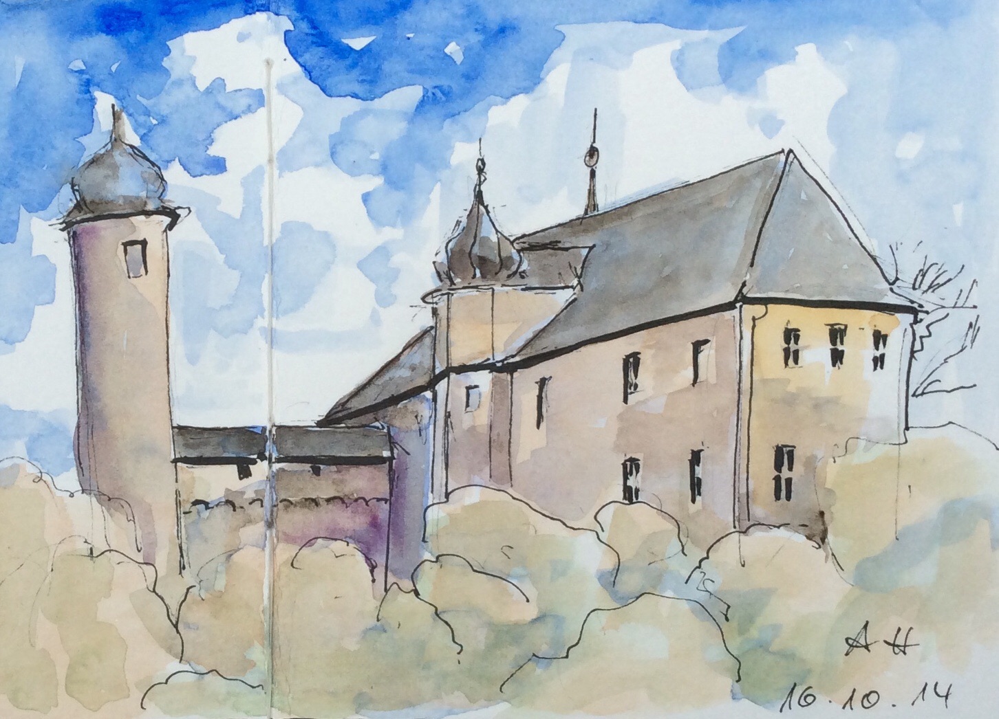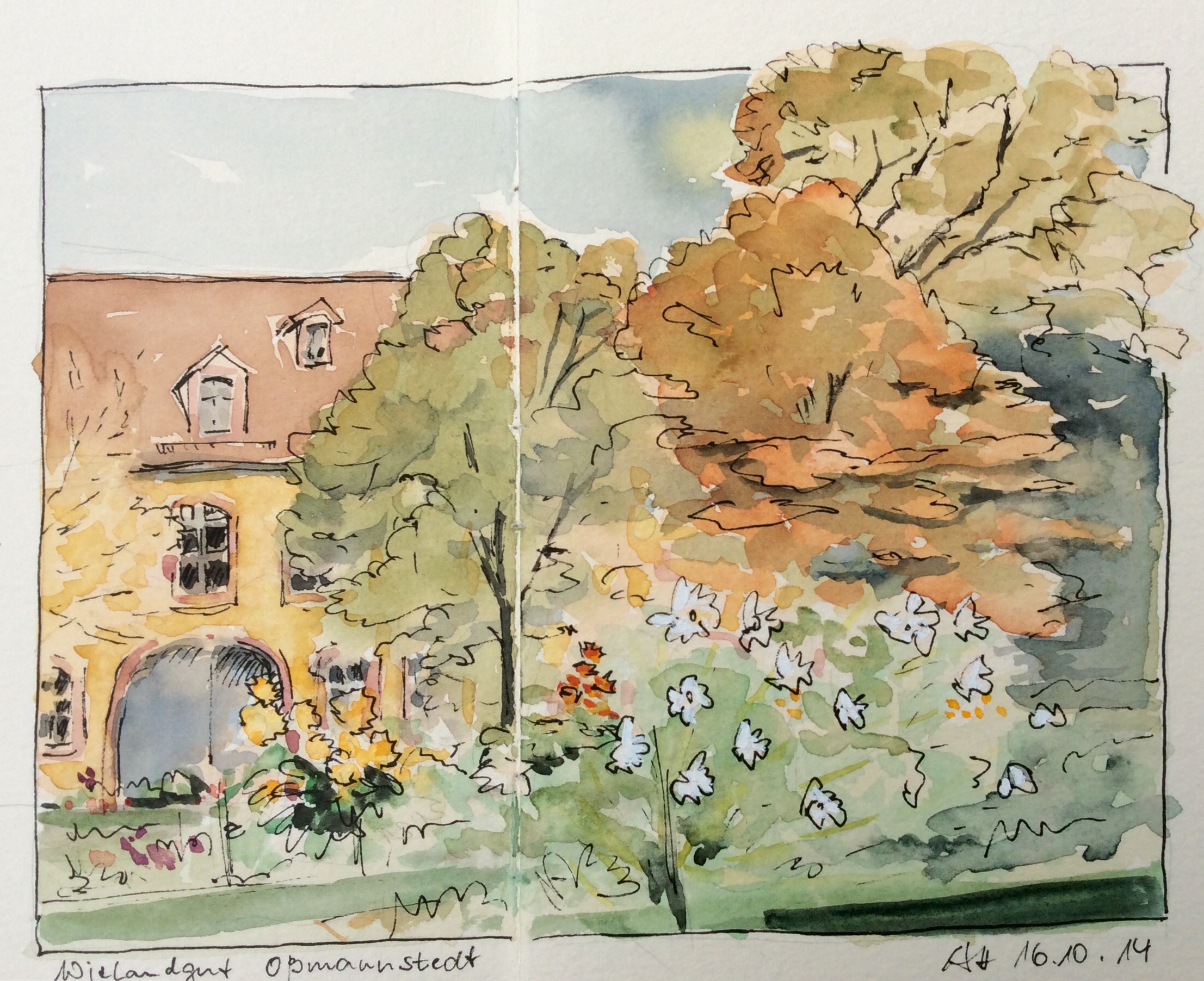 Veröffentlicht: 17. Oktober 2014 Abgelegt unter: Aquarell, Bewohntes Gelände, Bewohntes Gelände 2, Reiseskizzen, Urban Sketching | Tags: Thüringen Hinterlasse einen KommentarAm Ilmradweg schläft so manches im Dornröschenschlaf, besonders an einem verregneten Herbsttag (an dem, wenn man sie denn besonders dringend bräuchte, natürlich auch sämtliche Dorfgasthäuser geschlossen haben).