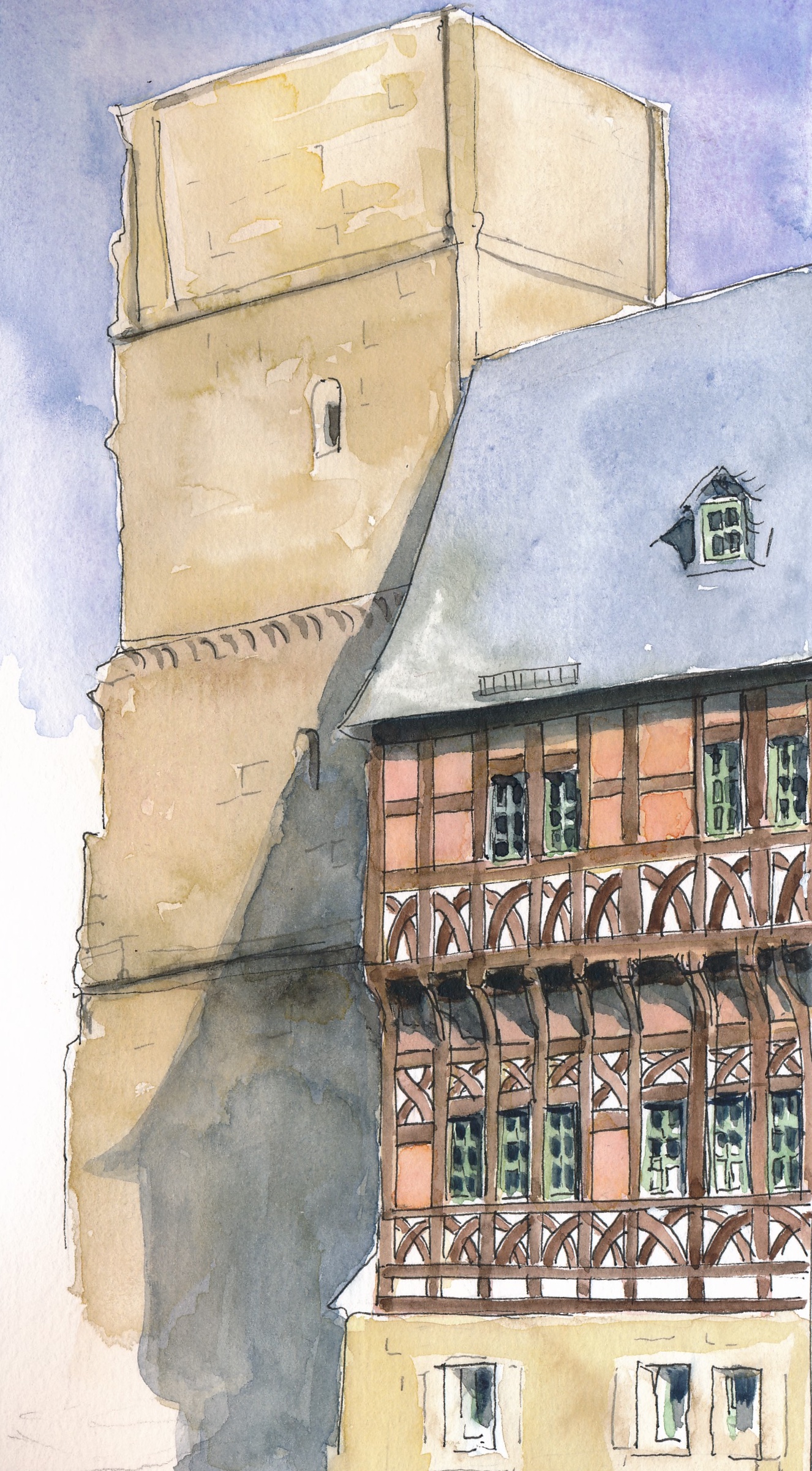 Ruine des Kirchturms von Kloster Paulinzella mit spätgotischem Amtsgebäude, Wasserfarbe und PITT-Marker in S&B Beta.