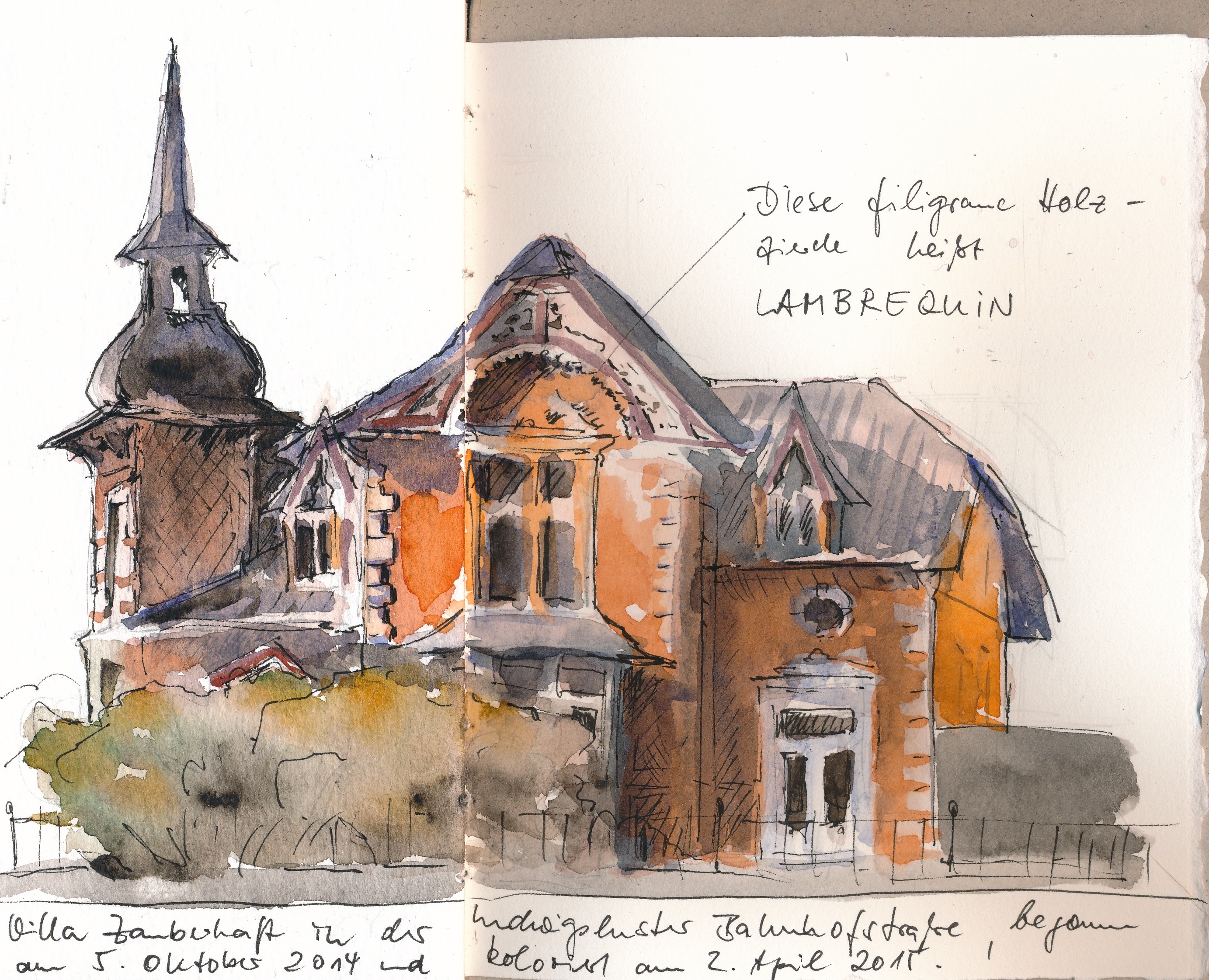 Heute morgen auf meinem Arbeitsweg schien dann die Sonne auf ein besonders schönes Exemplar in der Ludwigsluster Bahnhofstraße. Dieses Haus bekommt immer, wenn ich daran vorbeigehe, ein paar Extrablicke, ich habe es „Villa Zauberhaft“ genannt wegen seiner Türmchen, seiner geschwungenen Mansärdchen, seinem Stuck und eben seinem Lambrequin. Im Skizzenbuch vom vergangenen Frühherbst fand sich eine angefangene Zeichnung dieses Hauses, die ich heute koloriert habe.