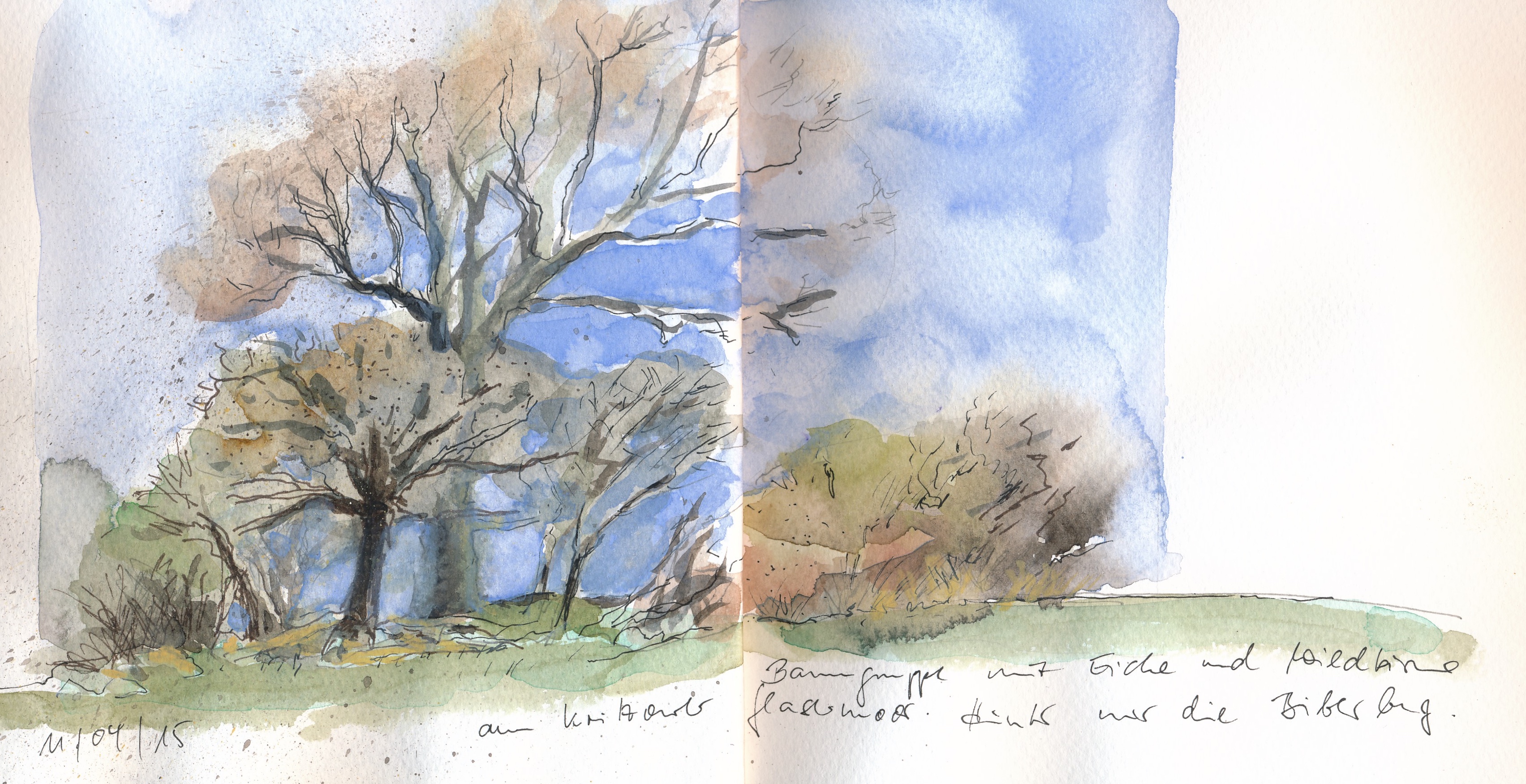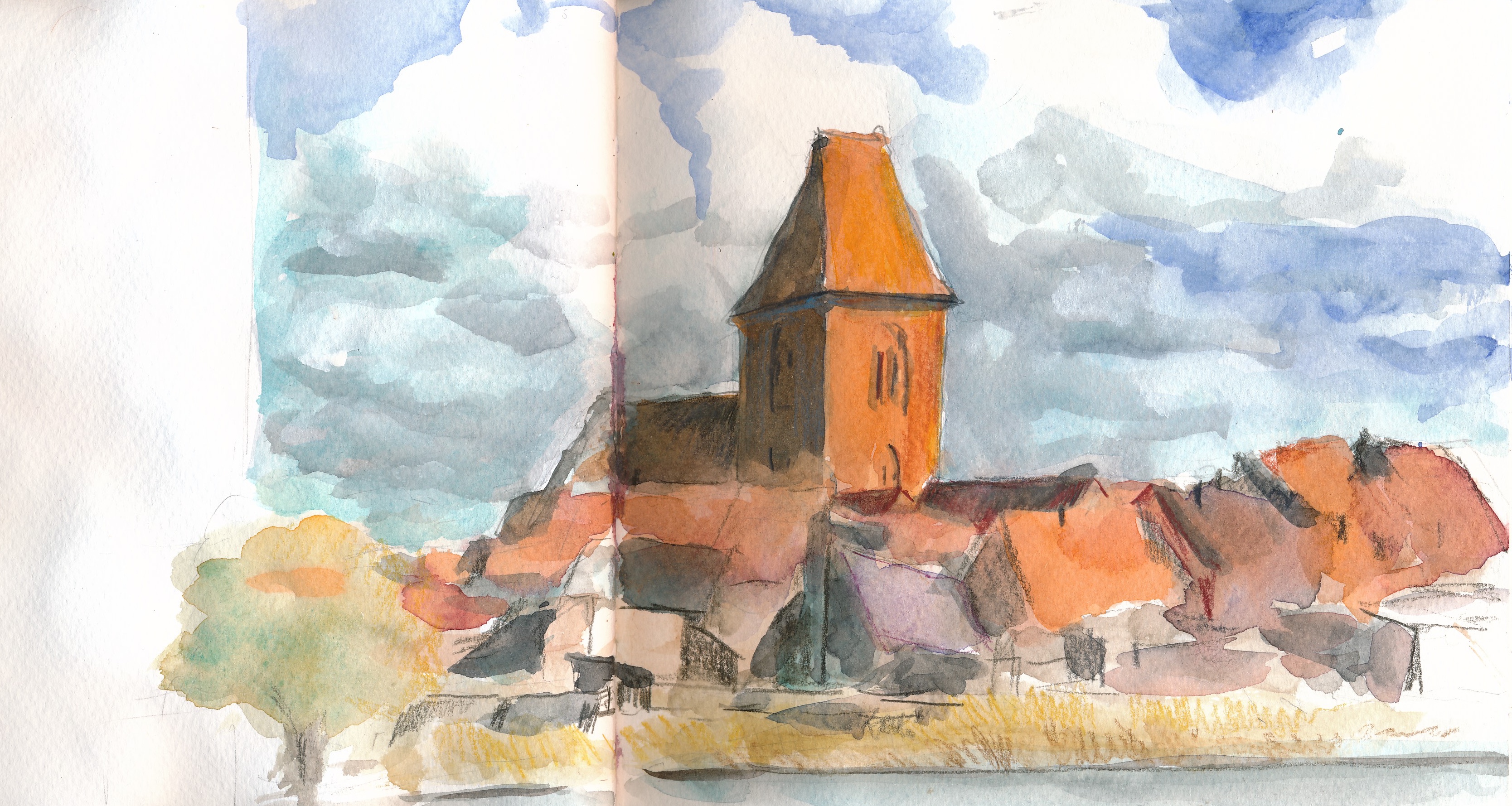 Nach der Wanderung sind wir noch an Crivitz vorbei gefahren, weil ich endlich einmal den schönen Blick auf das Städtchen über den See hinweg zeichnen wollte. Es war frappierend zu erleben, wie sich das Licht innerhalb einer halben Stunde ins gewittrige wandelte, und zu Hause – während sie Welt sich vor den Fenstern verfinsterte – habe ich noch ein bisschen eins draufgesetzt.