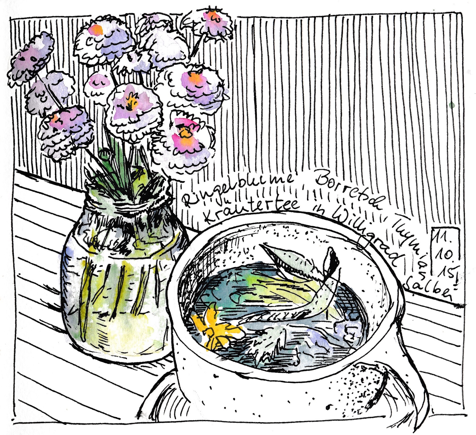 Veröffentlicht: 13. Oktober 2015 Abgelegt unter: Allgemein | Tags: Mecklenburg, Schwerin, Willigrad Hinterlasse einen KommentarAm Wochenende saß ich bei strahlendem Wetter im Café am Schloss Willigrad bei Schwerin. Neben hervorragendem selbst gebackenem Kuchen gibt es dort auch unschlagbaren Kräutertee – ein frisch aufgebrühtes Kräutersträußchen aus dem eigenen Garten. In meiner Tasse fand ich Thymian, Salbei, Borretsch und zur Dekoration ein leuchtend gelbes Ringelblümchen.