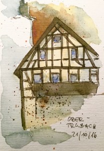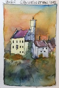 Veröffentlicht: 28. Oktober 2016 Abgelegt unter: Allgemein, Aquarell, Bewohntes Gelände 5, Ink&Wash, Reiseskizzen, Urban Sketching | Tags: Burg, Fränkische Schweiz, Oberfranken Hinterlasse einen KommentarDieses Jahr hatte ich auf meiner Wanderung neben meinem gebundenen Skizzenbuch auch ein Kästchen mit Aquarellpostkarten dabei. Das erwies sich als Glücksfall: auf Reisen bin ich mit meinen Zeichnungen im Reisetagebuch nicht so locker wie zu Hause, ist es weniger Skizzenbuch, habe ich eine gewisse Scheu vor dem Vorläufigen. Außerdem hatte ich dieses Jahr ein Exemplar mit sehr glattem Papier dabei – Stillman&Birn Zeta – das sich für exakte Studien am heimischen Zeichentisch gut eignet – für Aquarell unterwegs nur bedingt. Dazu noch die Kälte, in der die Farben langsam trocknen.