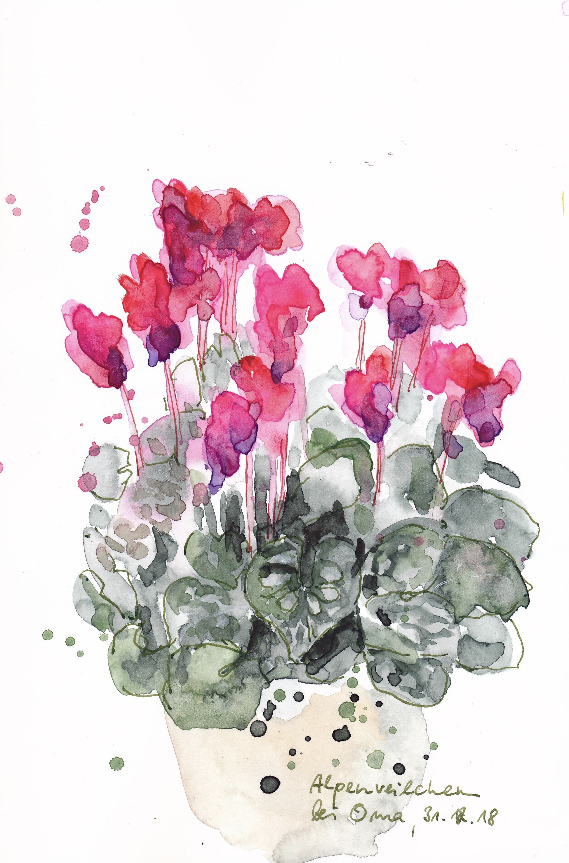 Veröffentlicht: 5. Januar 2019 Abgelegt unter: Alltag, Aquarell, Ink&Wash, Pflanzen, visuelles Tagebuch | Tags: Aquarell, Pflanzen 2 Kommentare„Wie heißt die Blume dort?“ – – – Meine greise Mutter kann sich Begriffe nicht mehr gut merken, und so fragt sie bei jedem Besuch aufs Neue, sichtlich erfreut von den kräftig purpurn leuchtenden Blüten. Am Silvestertag war für mich endlich die Gelegenheit für eine Skizze gekommen.