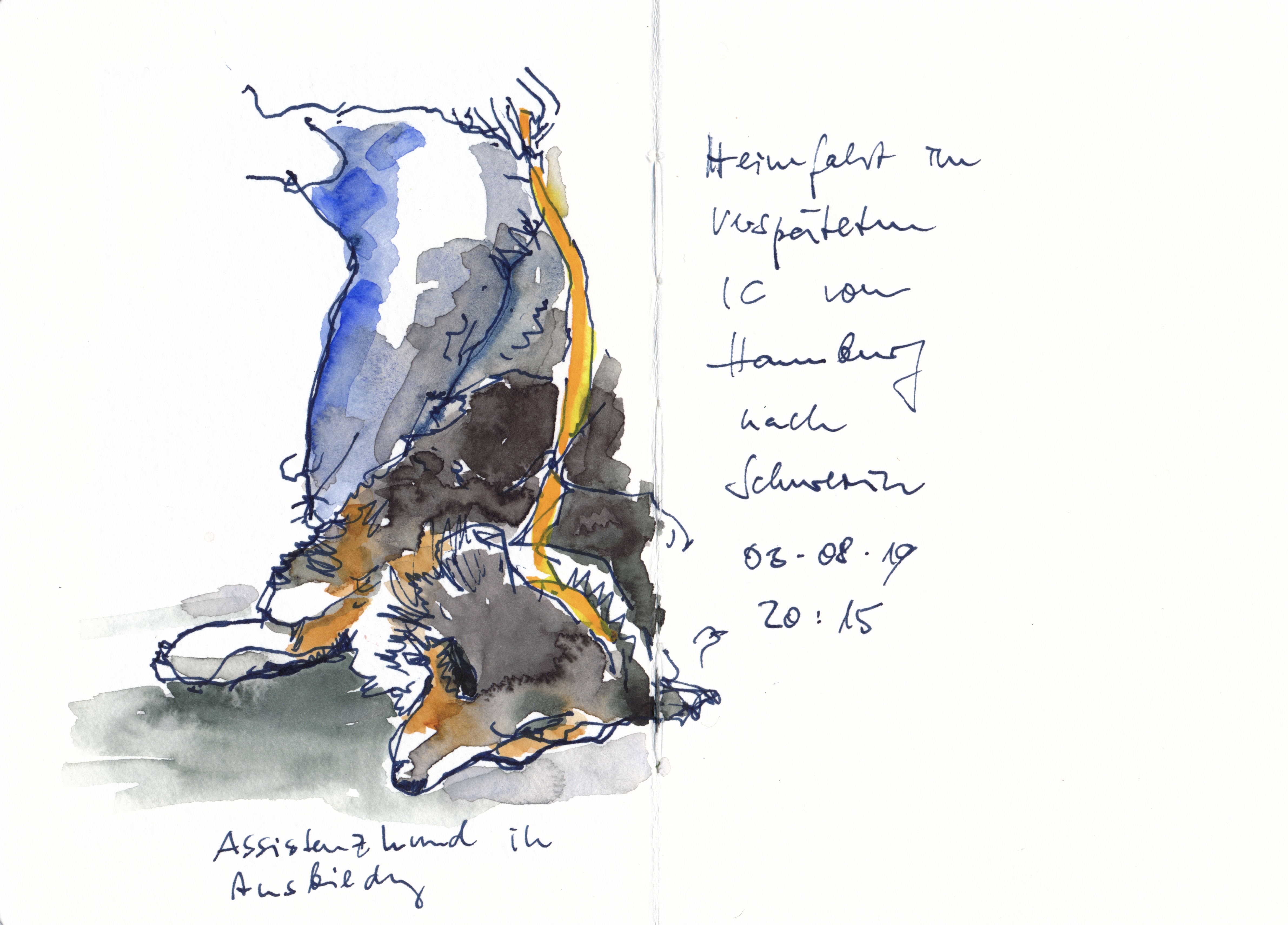 Zum guten Schluss kam der Zug doch – und ich hatte noch die Kraft, einen unendlich gelassenen Hund zu skizzieren.
