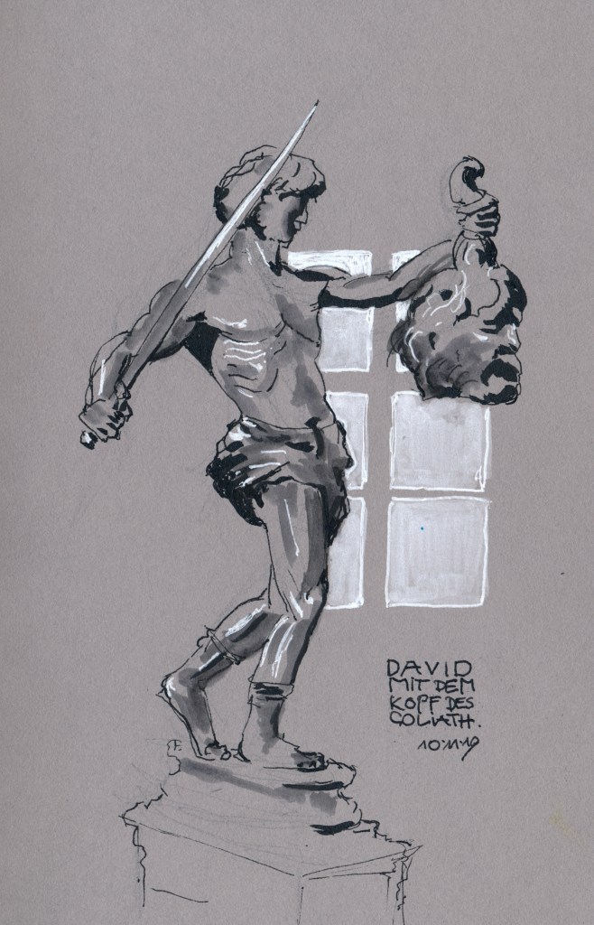 In einem versteckten Winkel des Burggartens steht dieser kriegerische David mit dem abgeschlagenen Kopf des Riesen Goliath und regte mich dazu an, zu meinen Inktober-Utensilien zu greifen: Stillman&Birn Nova Grey, Marker und Tinte in schwarz, weiß und grau. Das Fenster im Hintergrund suggeriert einen Innenraum – es war aber eine Spiegelung.