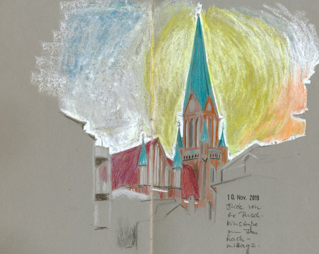Am Nachmittag, als die Sonne schon am Sinken war, kam noch ein drittes Bild dazu: der Blick auf den Dom vom Café Rothe in der Puschkinstraße aus. Dort hatten wir beim kleinen Nordtreffen am 01.Juni schon mal gesessen, ebenfalls bei schönsten Wetter – und wie anders wirkte das Motiv nun bei veränderter Tageszeit im Gegenlicht! Also holte ich noch einmal das S&B Nova heraus und skizzierte vor Ort lediglich die Dachlinie und einige wenige Binnenstrukturen. Die Farbe (und nicht zu wenig davon!) kam dann heute aufs Blatt.