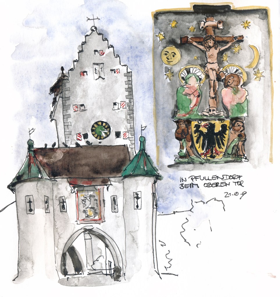 Als ich nach einer Rast aus der Kirche trat, hatte es sich bereits wieder zugezogen; am „Oberen Tor“ begann es zu tröpfeln, so dass ich sie nur in ihren Umrissen erfassen konnte. Das bunt bemalte Relief in seiner für das späte Mittelalter so typischen Mischung aus Volksfrömmigkeit und Bürgerstolz habe ich zu Hause nach Foto ergänzt.