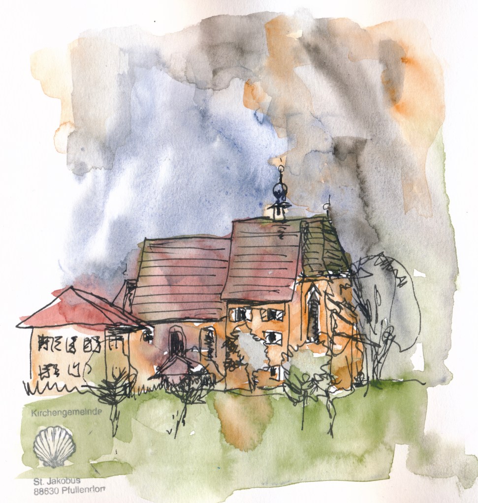 Veröffentlicht: 17. November 2019 Abgelegt unter: Allgemein, Bewohntes Gelände 9, Bewohntes Gelönde, Reiseskizzen, Urban Sketching, visuelles Tagebuch | Tags: Bodensee, Café, Wallfahrtskirche Hinterlasse einen Kommentar… ist, anders als der Name vermuten lässt, kein Dorf, sondern eine Kleinstadt in Bodenseenähe. Mein letzter Wandertag hatte von Wald noch einmal durch den Wald geführt, der hier schon hügeliger wurde und nicht mehr so sumpfig war wie am Vortag. Als er sich sich nach einigen Kilometern unvermittelt öffnete, hatte es auch die Sonne durch den Nebel geschafft und die Stadt lag mit schöner Silhouette am gegenüberliegenden Hang.