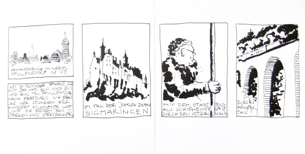 Von Pfullendorf nach Freiburg sind es gute einhundert Kilometer Luftlinie – und als Nordlicht hatte ich mir die Karte noch nie genau genug angesehen, um zu wissen, wo mich die fünf Stunden Fahrt mit öffentlichen Verkehrsmitteln überall hinführen würden. Erstmal: Mit dem Bus bis zum Zug ab Sigmaringen, von dort im dramatischen Morgenlicht an Felsen und Burgen und Felsen und Burgen vorbei, um Kurven und durch Tunnel. Die Busfahrt von Donaueschingen nach Titisee bot Gelegenheit, die Mitreisenden zu zeichnen, bis die Reise mit der Höllentalbahn ein spektakuläres Finale fand. Auf nur 25 km überwindet sie 600 Höhenmeter, fährt über alte Viadukte, durch enge Schluchten und noch engere alte Tunnel …