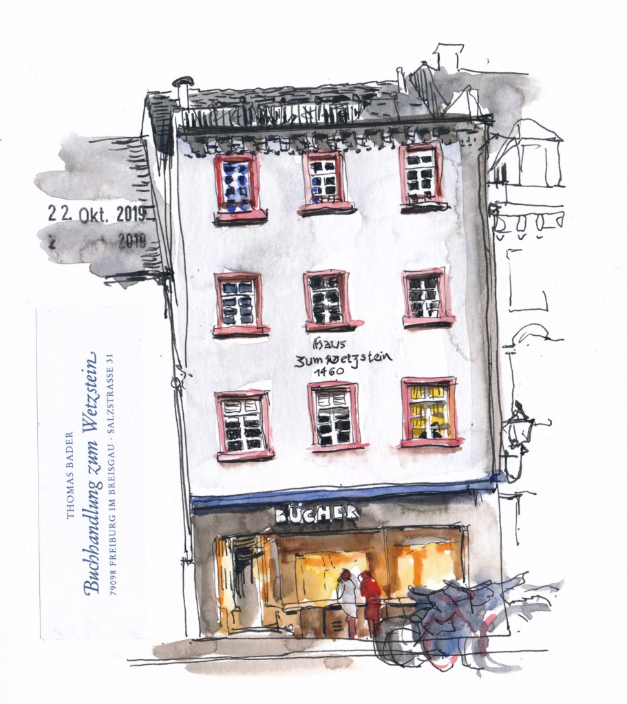 Veröffentlicht: 24. November 2019 Abgelegt unter: Allgemein, Bewohntes Gelände, Bewohntes Gelände 9, Reiseskizzen, Urban Sketching, visuelles Tagebuch | Tags: Baden, Bücher, Freiburg/Br. Ein KommentarEs war um 2011 herum, als ich das erste Mal vom „Wetzstein“ hörte; ich weiß nicht mehr, wo und wie, doch stand ich (dienstlich in der Region unterwegs) nicht zufällig vor dem Buchgeschäft in der Freiburger Salzstraße. So hatte ich mir einen Buchladen immer vorgestellt, mit ganzen Sortimenten in den Regalen, mit Schränken voller Insel und Manesse, mit Lyrik- und Philosophieregalen, mit gerahmten Schriftstellerbriefen an den Wänden und Lederausgaben im Hinterzimmer.