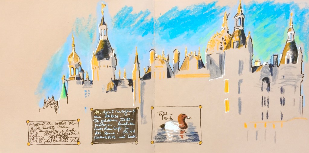 Veröffentlicht: 20. April 2020 Abgelegt unter: Urban Sketching, visuelles Tagebuch | Tags: Pat Southern-Pearce, Schwerin Hinterlasse einen KommentarWenn der Ostwind zu scharf über den See weht, kann man natürlich auch in die andere Richtung zeichnen. Zumal, wenn da etwas so hinreißendes steht wie das Schweriner Schloss. Zwar gab es auch hier nur einen Stehplatz, aber immerhin einen mit einer Steinbalustrade in richtiger Zeichenhöhe.