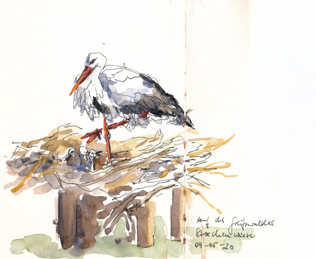 Veröffentlicht: 18. Mai 2020 Abgelegt unter: Alltag, Urban Sketching, visuelles Tagebuch | Tags: Greifswald Hinterlasse einen KommentarIn Greifswald war ich auf Familienbesuch, also bekamen Dom und Marienkirche nur ein paar kurze Blicke. Stattdessen zeichnete ich im Tierpark – erst mit schnellen Strichen Alpakas und Erdmännchen und schließlich mit wachsendem Vergnügen die Störche auf der Storchenwiese. Dort brüten flugunfähige Vögel in bodennahen Nestern – eine einmalige Gelegenheit zur Beobachtung der Tiere.
