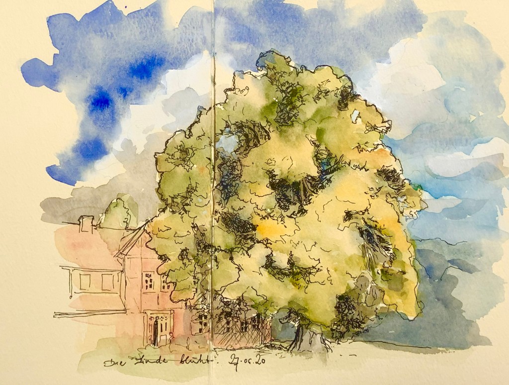 Am Nachmittag zeichnete ich die Linde dann als Ganzes, gelb vor Blüten in der tiefer stehenden Sonne. Der Untergrund ist gelb getöntes Aquarellpapier aus Uraltbeständen in einem selbst gebundenen Buch.