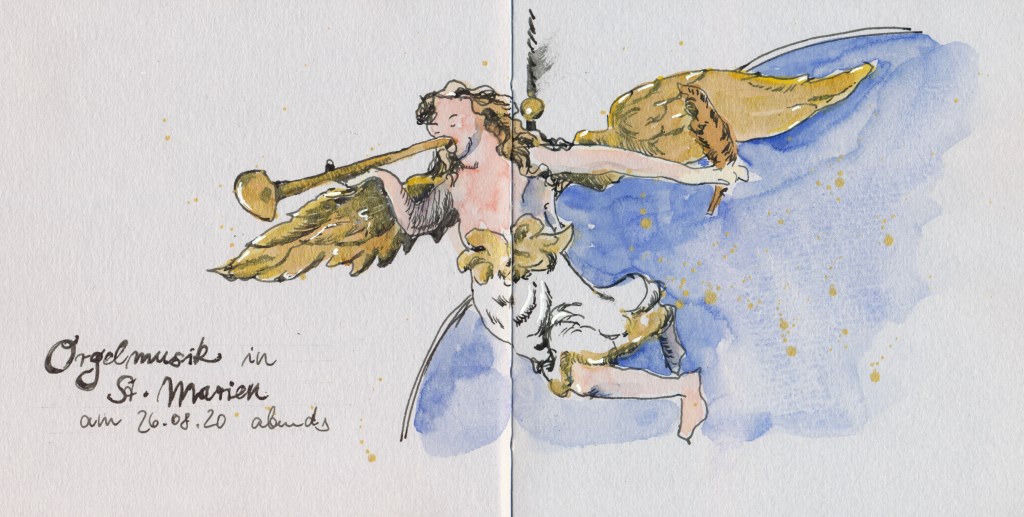 Abends gab es Orgelkonzert. In der Stralsunder Marienkirche, direkt gegenüber meines Quartiers, wurde Orgelmusik aus Renaissance und Barock gegeben. Ich schaute mich derweil ein bisschen um. Der schwebende Engel – er gehört zu der auch sonst reich verzierten Orgel – hing leider direkt hinter mir, so dass ich vor Ort nur den Umriss zeichnete, alles andere kam zu Hause.