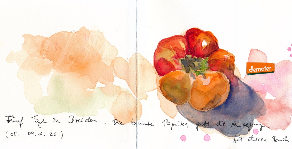 Mein erstes Leporello habe ich vor zwei Wochen in Dresden bei Gerstäcker gekauft, von Hahnemühle, handschmeichelnd klein und quadratisch. Es schien mir das Richtige für ein paar Tage, die ich vorwiegend in Gesellschaft verbringen würde und wo Zeichenzeit eher nebenbei anfallen würde. Schon im Harz hatte ich damit begonnen, meine Zeichengründe mit Aquarellfarbe zu grundieren – so färbte ich auch gleich den ganzen Leporello in Herbstfarben ein.