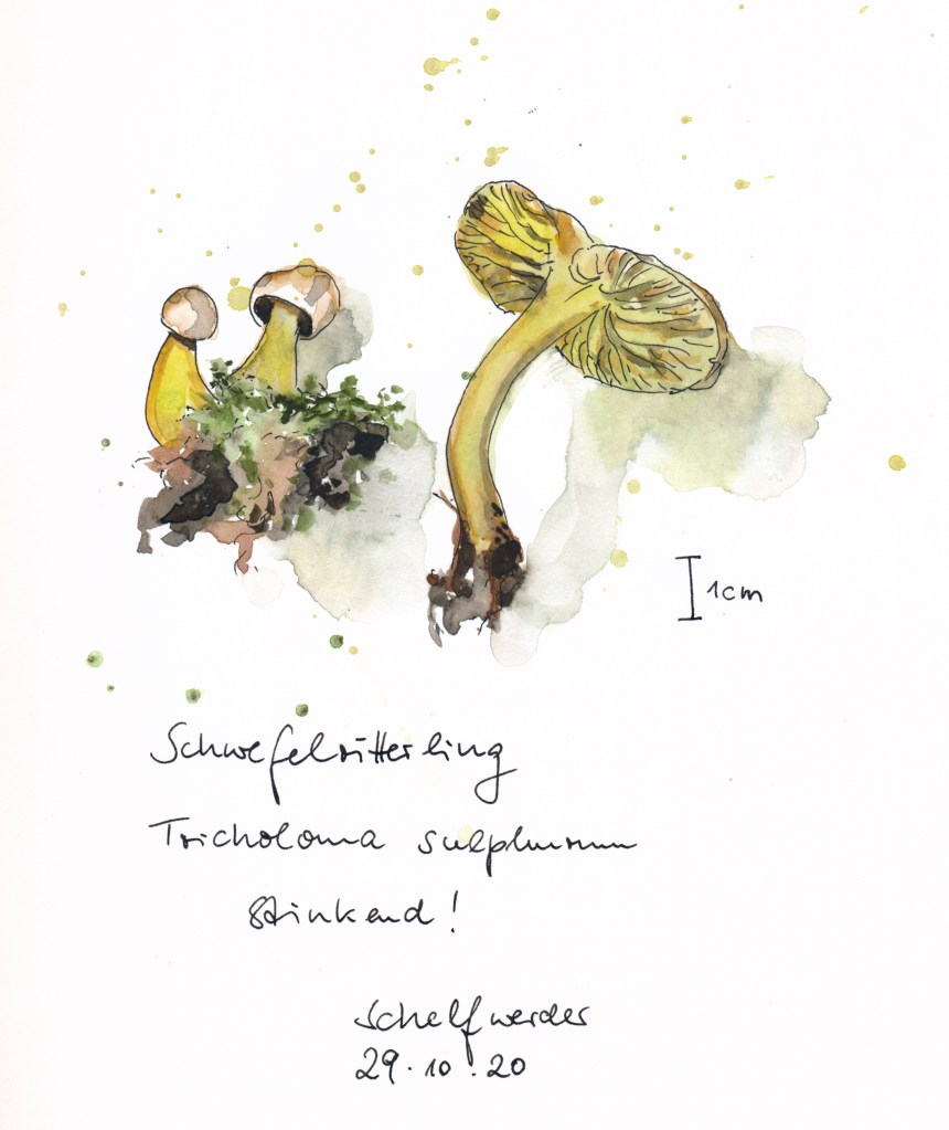 Auch den Schwefelritterling hatte ich bisher noch nie gesehen – er hat seinen Namen von der schwefelgelben Farbe. Er könnte ihn auch von seinem höllischen Gestank haben, der an, nun ja, tranige menschliche Ausdünstungen denken lässt.
