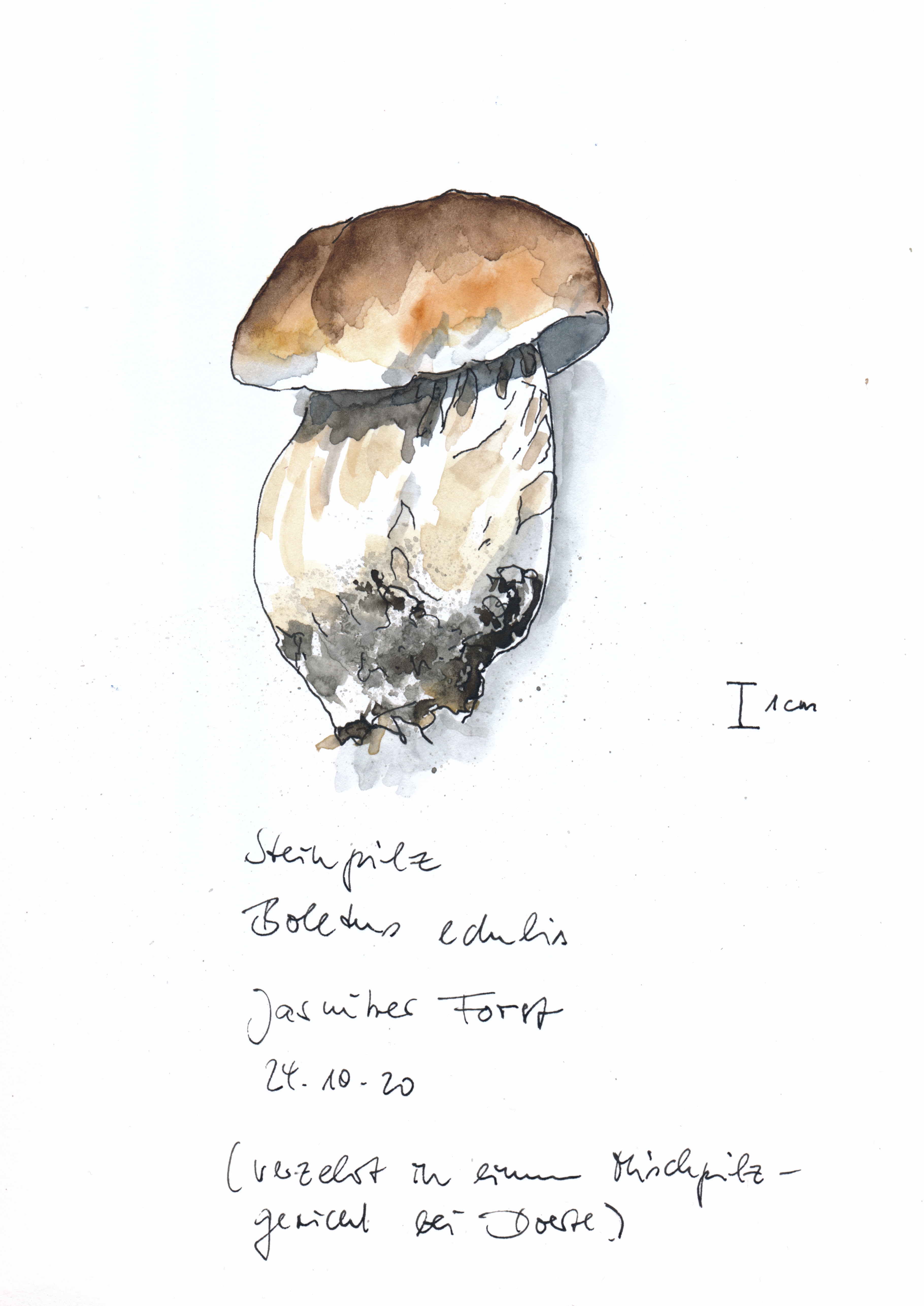 Bevor ich mich in den sumpfigen Laubwäldern um Schwerin mit giftigen Raritäten beschäftigte, hatte ich eine schöne Sammeltour in einem ausgedehnten Kiefernwaldgebiet gemacht. Butterpilze für mehrere Großfamilien, ausreichend Maronen und leider nur ein Edelreizker und ein Steinpilz waren die Ausbeute. Den Steinpilz, ein kleines, aber mustergültiges Exemplar habe ich zu Papier gebracht.