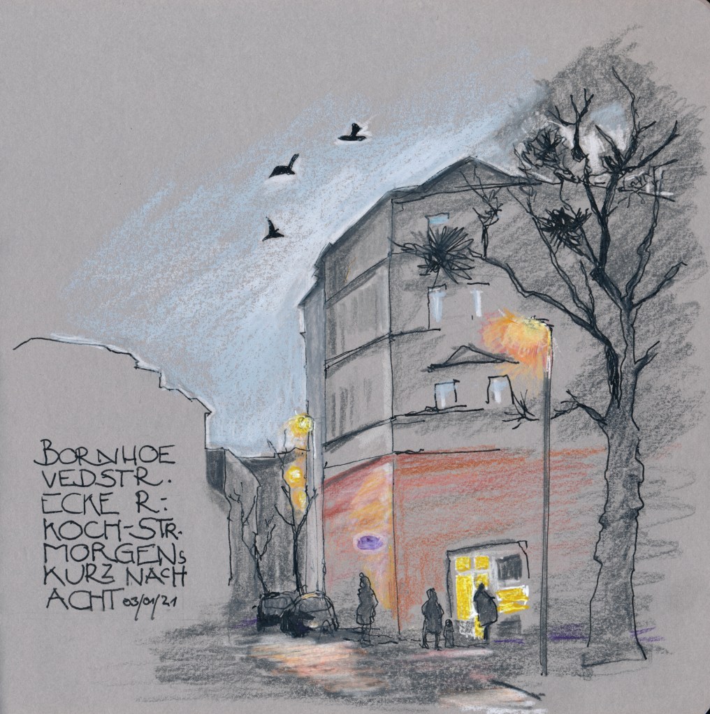 Veröffentlicht: 3. Januar 2021 Abgelegt unter: Urban Sketching, visuelles Tagebuch | Tags: Schwerin Ein Kommentar… ist eine Zeit, in der ich auch im Winter an freien Tagen eine Runde drehe; später kann ich mich oft nicht mehr aufraffen. Einer meiner Lieblingswege führt durch ein Stück altmodischer Vorstadt, in dem sich letzte Fachwerkhäuser (von der einfachsten Sorte) mit sozialem Wohnungsbau in Art déco und Backsteinexpressionismus treffen; das Seeufer ist mit kleinen Bootswerften und dergleichen bebaut. Natürlich dürfen auch Rotdorn und Linde nicht fehlen.