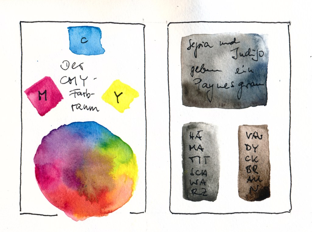 Zuerst einmal die Primärfarben, wie wir sie von jedem Farbdrucker kennen – CMY. Cyan (Schmincke Heliocoelin), Magenta, Yellow (Kadmiumgelb hell). Wäre ich einer, würde ich damit alle Farben hinbekommen. Jedenfalls theoretisch. Denn auch so ein Drucker – der ebenfalls ein Aquarellist ist und mit der Helligkeit des Papiers arbeitet – braucht etwas Dunkles für die Schatten. Die „dunkle Ecke“ des kleinen Kastens enthält bei mir zur Zeit fünf Farben – vier davon sind im rechten Kästchen zu sehen. Oben Sepia und Indigo – beides moderne Nachstellungen traditioneller Farben. (Gerne würde ich mal mit echtem „Sepia“ vom Tintenfisch malen und erfahren, wie sich diese Farbe anfühlt.) Zusammen ergeben die beiden „mein“ Paynesgrau und dick aufgetragen ein lebendiges Schwarz. (Der englische Landschaftsmaler William Payne kam als erster auf die Idee, ein lebendiges Grau aus verschiedenen „farbigen“ Tönen zu mischen.)