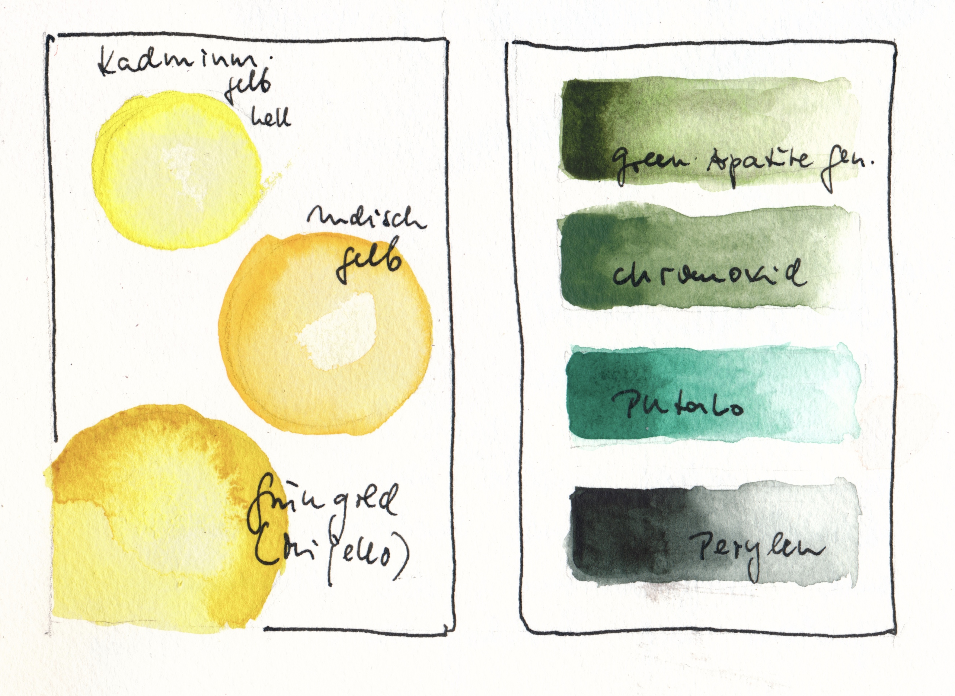 Unter den Gelbtönen ist ein Neuling. Neben Kadmiumgelb hell, stark deckend und als „Yellow“ eine der drei Grundfarben, und dem lasierenden und strahlenden Indischgelb ist eine Farbe namens „Grüngold“ von der koreanischen Firma „Mijello“ (PY 150, Nickel-Azo-Gelb) dazugekommen. Die Charakteristik dieser Farbe lässt sich am Bildschirm kaum zeigen, sie leuchtet selbst stark verdünnt noch in einem fluoreszierenden, fast giftigen Ton. Es gibt sie auch von anderen Herstellern; ich hatte sie gerade von Mijello zur Hand.