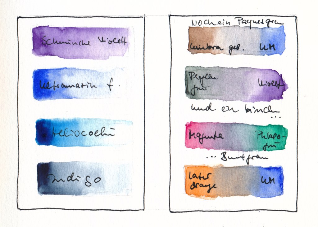 Gleich neben den Schwarzäquivalenten kommen die Blautöne. Indigo ist schon der erste von ihnen, Heliocoelin haben wir als „Cyan“ kennengelernt, dazu noch Ultramarin. Auch Ultramarin ist ein Universalist, passt sich überall an, bringt Schatten zum Leuchten und Himmel zum Strahlen. Nach einem Versuch mit dem stark granulierenden „Französisch Ultramarin“ bin ich wieder zu „Feinst“ zurückgekehrt.