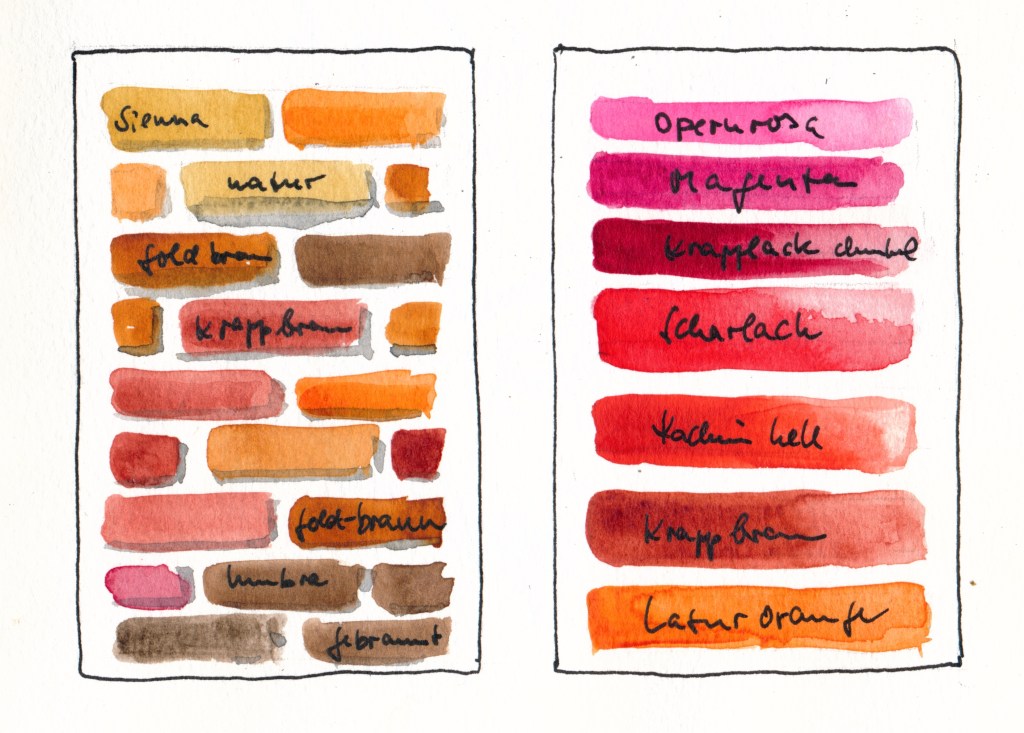 Bliebe noch das Rot. In einem Kasten, mit dem unterwegs gearbeitet wird, habe ich eine Menge Rottöne dabei. Neben Ziegelmauern – die es hierzuland reichlich gibt – wollen auch Blüten bedacht werden, Früchte, menschliche Gesichter und Sonnenaufgänge. Rottöne lassen sich erstaunlich schlecht mischen und werden in Verdünnung manchmal fade – dagegen hilft z.B. das Opernrosa mit seinen Fluoreszenzanteilen, grell wie eine Operndiva. Hat es daher seinen Namen? Ich weiß es nicht.