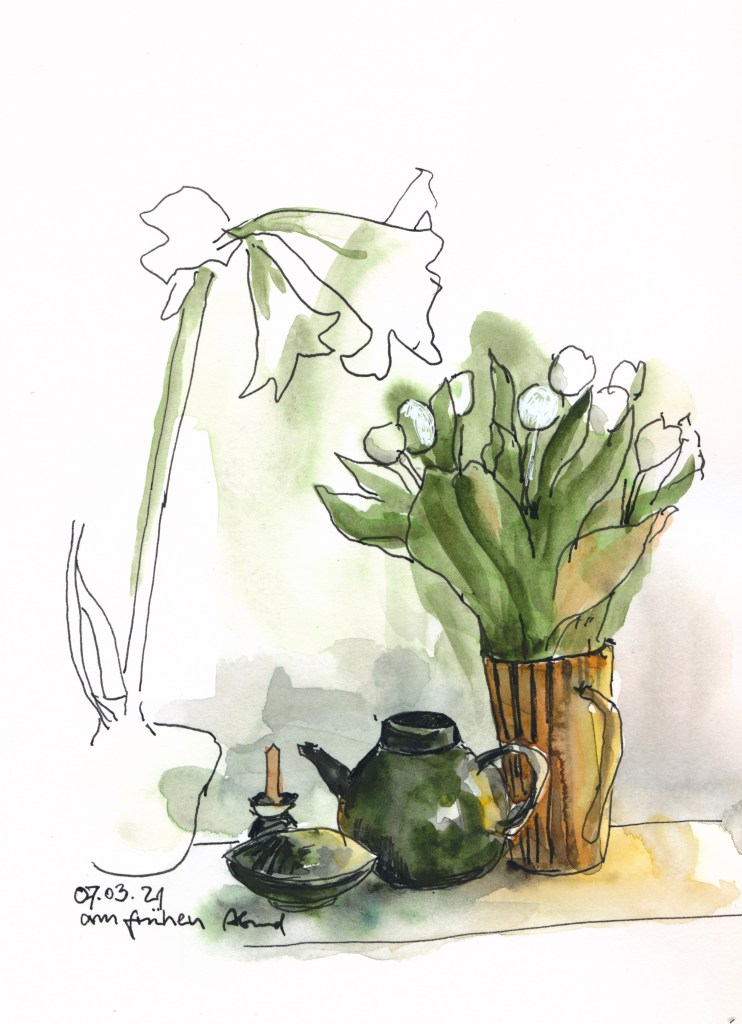 Veröffentlicht: 7. März 2021 Abgelegt unter: Alltag, Dinge, Ink&Wash, visuelles Tagebuch | Tags: Bollhagen, Tulpe Hinterlasse einen Kommentar… meines Wohnzimmers wird immer mal umgeräumt, es ist eine kleine Bühne mit saisonalen Akteuren. Jetzt, Anfang März, träumt sie von einer Osterdekoration in Pastelltönen. Höchste Zeit für ein Bild von dem, was dort in den letzten Wochen stand. („Nagori“ heißt es in Japan – „Die Sehnsucht nach der von uns gegangenen Jahreszeit“.) In diesem Winter waren das weiße Blumen in dunklen Gefäßen, eingerahmt von ein paar schwarz-grünen Bollhagen-Kleinigkeiten. Den großen Auftritt haben sie nicht bekommen, der ging an das warme Lampenlicht, das an diesem grauen Abend schon früh die Oberhand gewann. (Die Vase, obwohl sie so aussieht mit ihren Streifen und dem unnachahmlichen Winkelmaß der Mitte des letzten Jahrhunderts, ist nicht von Bollhagen.)