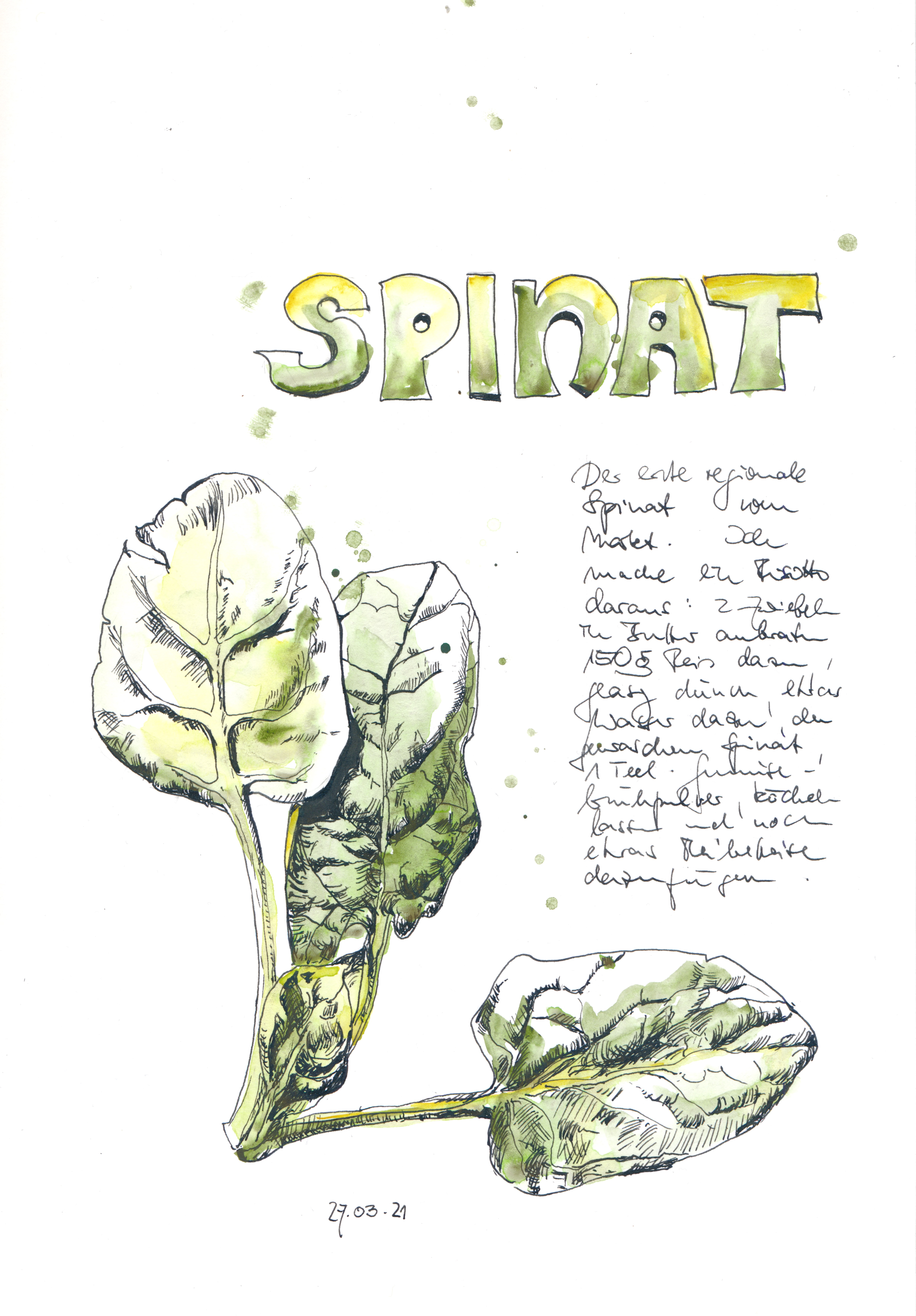Veröffentlicht: 28. März 2021 Abgelegt unter: Alltag, Ink&Wash, Pflanzen | Tags: Gemüse, Kochrezept Hinterlasse einen KommentarAls Kind konnte ich, die sonst fast alles und viel zu gern aß, mir einfach nicht vorstellen, dass Menschen ohne Not Spinat auf ihre Teller legen. Diese kuhfladengrüne Masse, die am Schulspeisungsschalter – klatsch! – auf den Teller gepappt wurde, gefolgt von einem – plopp! – ungeschälten blaugekochten Ei – nein, das konnte kein Mensch freiwillig essen!