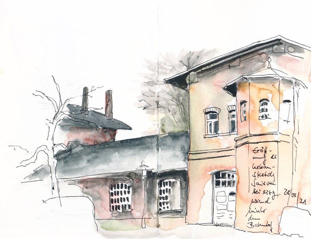 Am nächsten Tag wurde es ernst: wir waren zum gemeinsamen Zeichnen draußen verabredet. Es war kalt und dank der Zeitumstellung auch noch sehr morgens, als wir uns am Schweriner Bahnhof trafen. Wir blieben erst einmal dort, wo wir den Windschatten des Bahnhofsgebäudes vermuteten und zeichneten ein paar alte Bahngebäude. Mein erster Versuch endete mit heißem Tee auf dem Skizzenbuch; den zweiten führte ich mit den am Vortag schon bewährten Aquarellstiften aus. Die Farbe kam heute zu Hause.