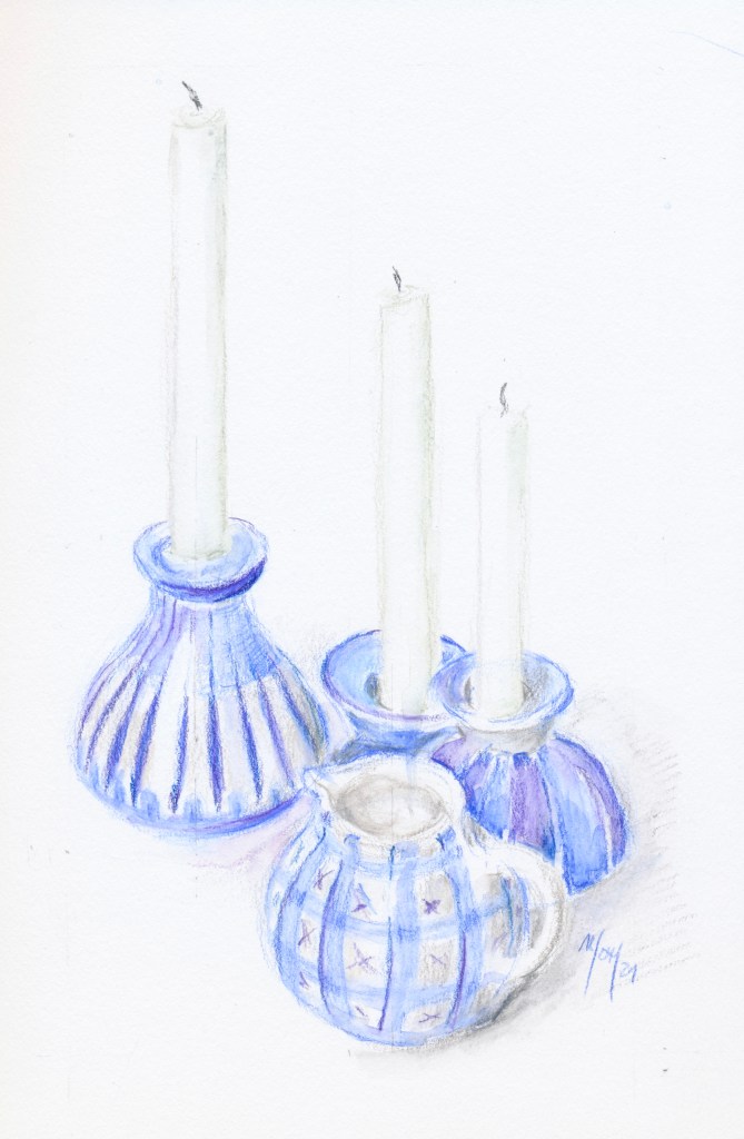 Für meine diesjährige Osterdekoration habe ich aus den Tiefen des Küchenschranks einige Kerzenhalter und andere Kleinteile in diesem Stil hervorgeholt, die sonst selten den Weg auf den Tisch finden. Als ich sie in den Wochen vor Ostern aufstellen wollte, musste ich feststellen, dass passende Kerzen nicht zu bekommen waren. Sie sind aus der Mode gekommen, wenn man von dem Saisonartikel „Pyramidenkerze“ absieht, der pünktlich zum 23.12. aus allen Regalen verschwindet.