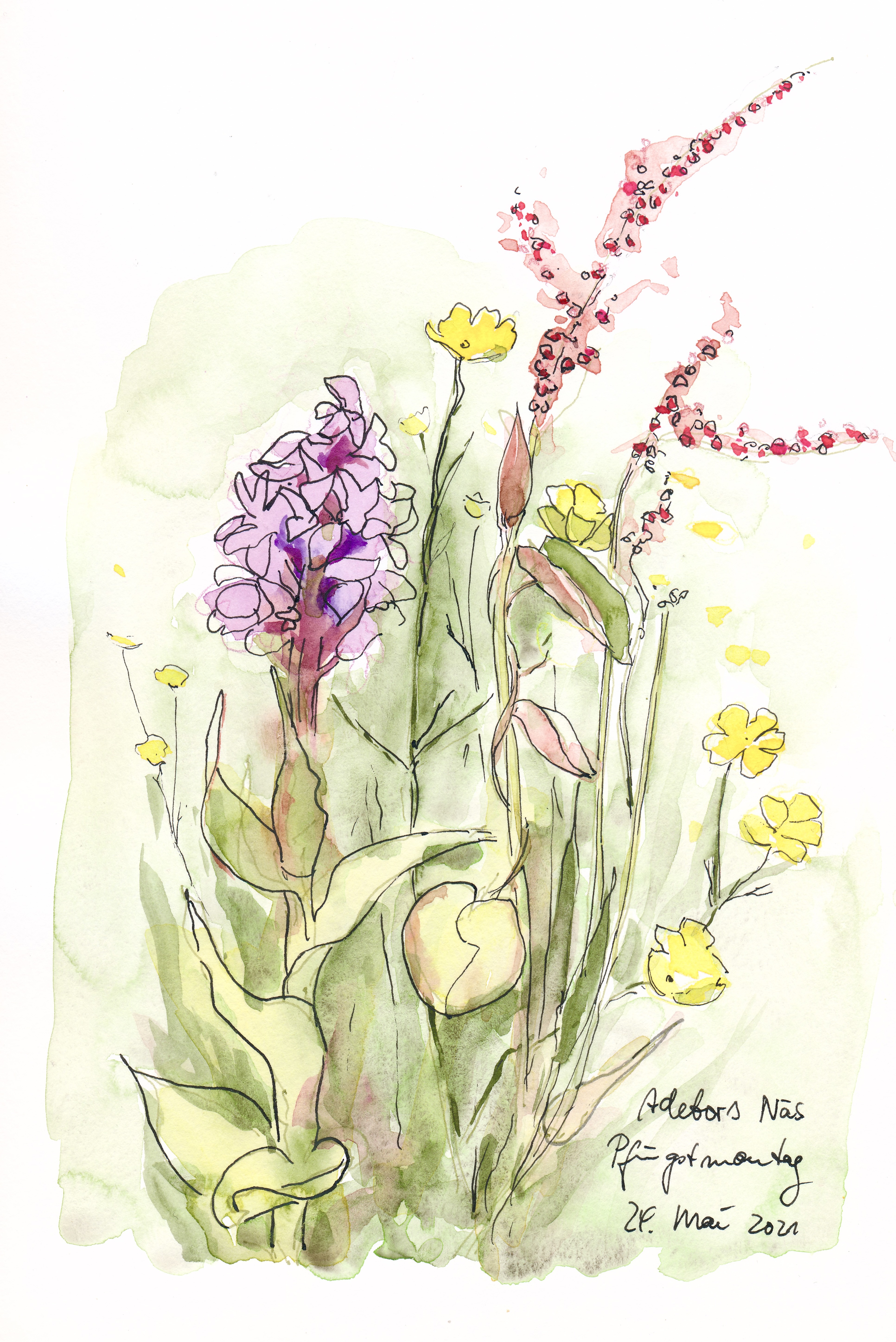 Am Pfingstmontag hatte ich mir vorgenommen, dort zu zeichnen, möglichst früh am Tag. Von mir zu Hause aus laufe ich eine gute Stunde (und zu laufen war mir ein Bedürfnis); als ich ankam, stand die Sonne schon hoch am Himmel und die einzige Wanderin war ich auch nicht mehr. So beschränkte ich mich beim Zeichnen auf die Umrisse. Zu Hause habe ich nach Foto koloriert und ergänzt, um einen kleinen Eindruck der charakteristischen Pflanzengemeinschaft wiedergeben zu können.