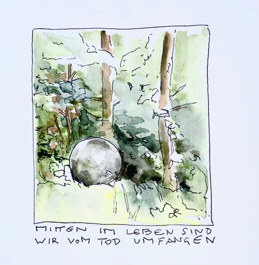 Es gibt noch einen ganz konventionellen Stein für die beiden Piloten, eine Metalltafel, die das Ganze erklärt und auf dem auch der Satz mitten im Leben sind wir vom Tod umfangen“ steht.