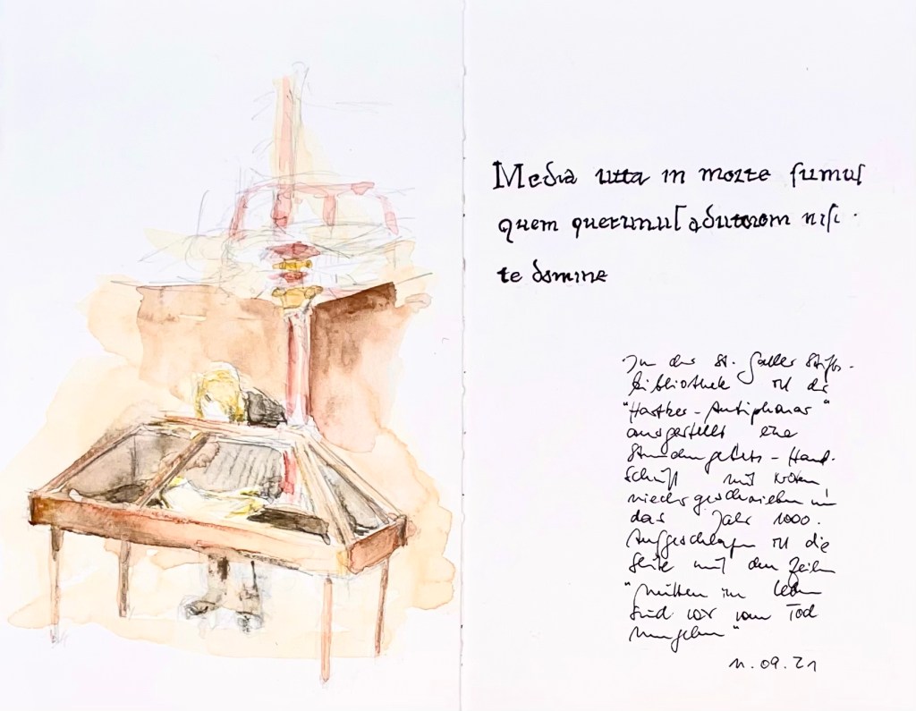 Veröffentlicht: 11. September 2021 Abgelegt unter: Allgemein, Bewohntes Gelände 10, Reiseskizzen | Tags: Bibliothek, Kloster, Mittelalter, Pilgerweg, Romanik, St.Gallen Hinterlasse einen KommentarDer heutige Tag gehörte der Stiftsbibliothek von St.Gallen, einer der größten Sammlungen mittelalterlicher Handschriften und Artefakte weltweit und der einzigen Klosterbibliothek, deren Bestände seit dem sehr frühen Mittelalter (um 700) in großer Zahl erhalten sind. Zuerst ging ich in den barocken Bibliothekssaal, der mit seinen geschmückten Galerien und seinen honigfarbenen Holzpaneelen als solcher schon sehenswert ist. In diesem Saal gibt es Wechselausstellungen originaler Bücher und Handschriften, in diesem Jahr lautete das Thema „Gebet“.