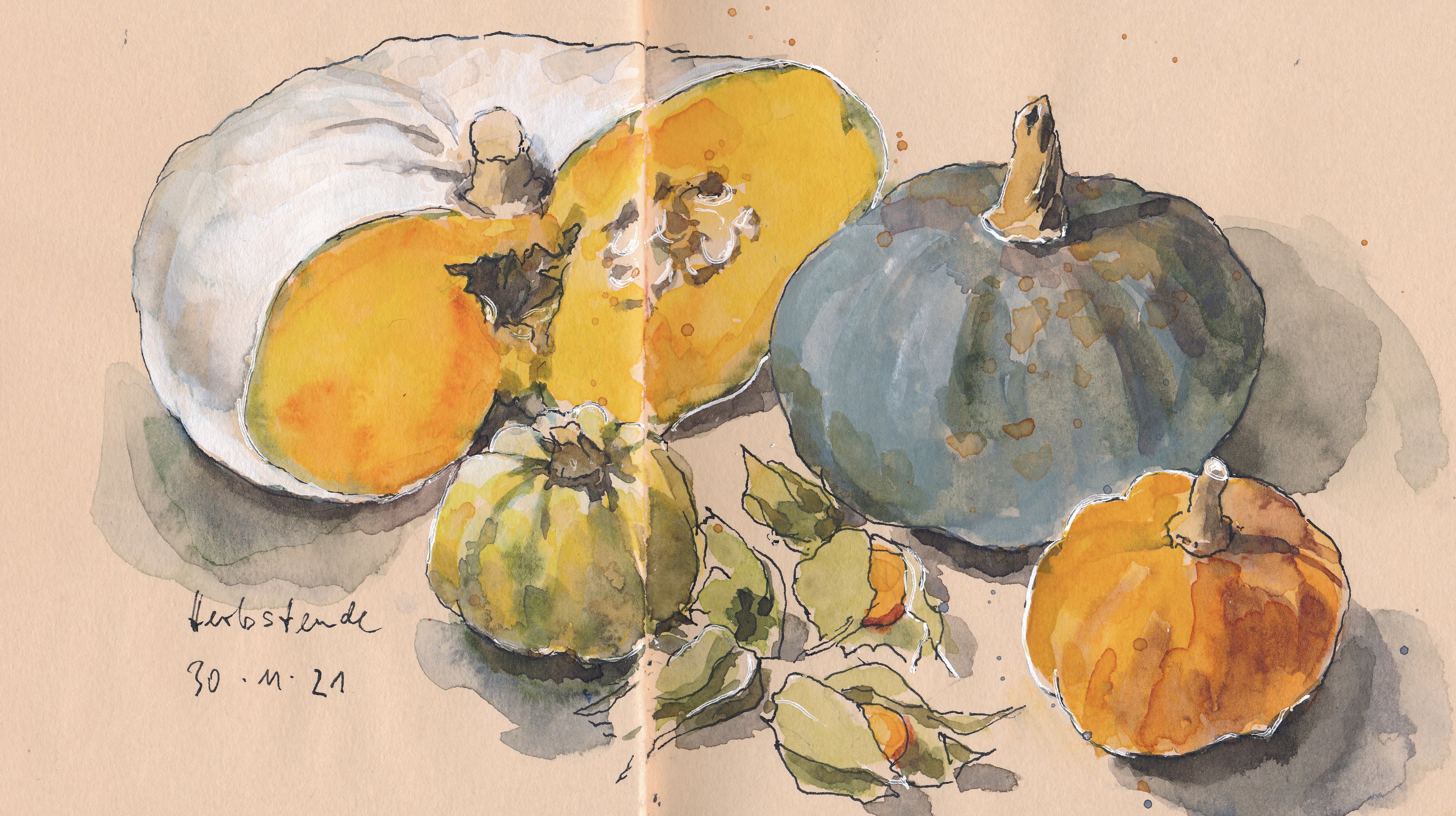 Da liegen sie nun, dekorativ angeordnet und ergänzt um die farblich und saisonal passende Physalis, die meine Zeichenfreundin zu diesem gemütlichen Nachmittag mitgebracht hatte. (Die Schrift und das Datum kamen ein paar Tage später, als ich noch ein paar letzte Schatten und Lichter angebracht habe.)