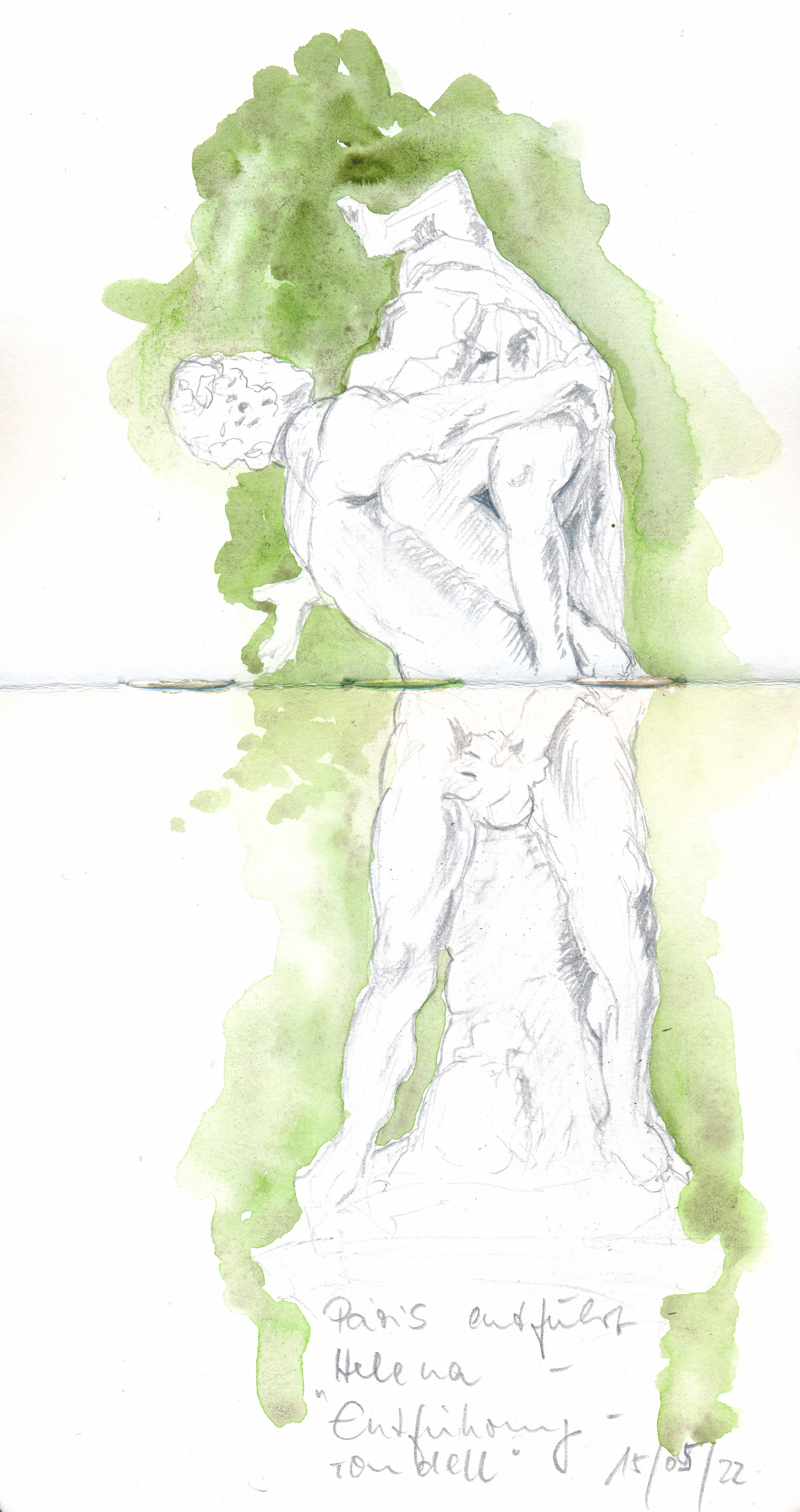 Vergangene Woche brachte ich einen ganzen Tag zeichnend im Park Sanssouci zu – ein reines, lange nicht gefühltes Glück und eine gute Gelegenheit, die Hand-Auge-Koordination wieder in Gang zu bringen. Am frühen Abend saß ich in einem der Rondelle, zu denen die Hauptallee sich weitet, und zeichnete „Paris entführt Helena“ im „Entführungsrondell“ – eine sich windende und zappelnde Marmorschönheit neben der anderen …
