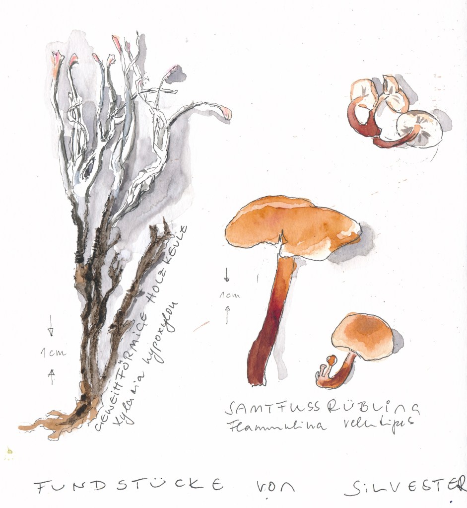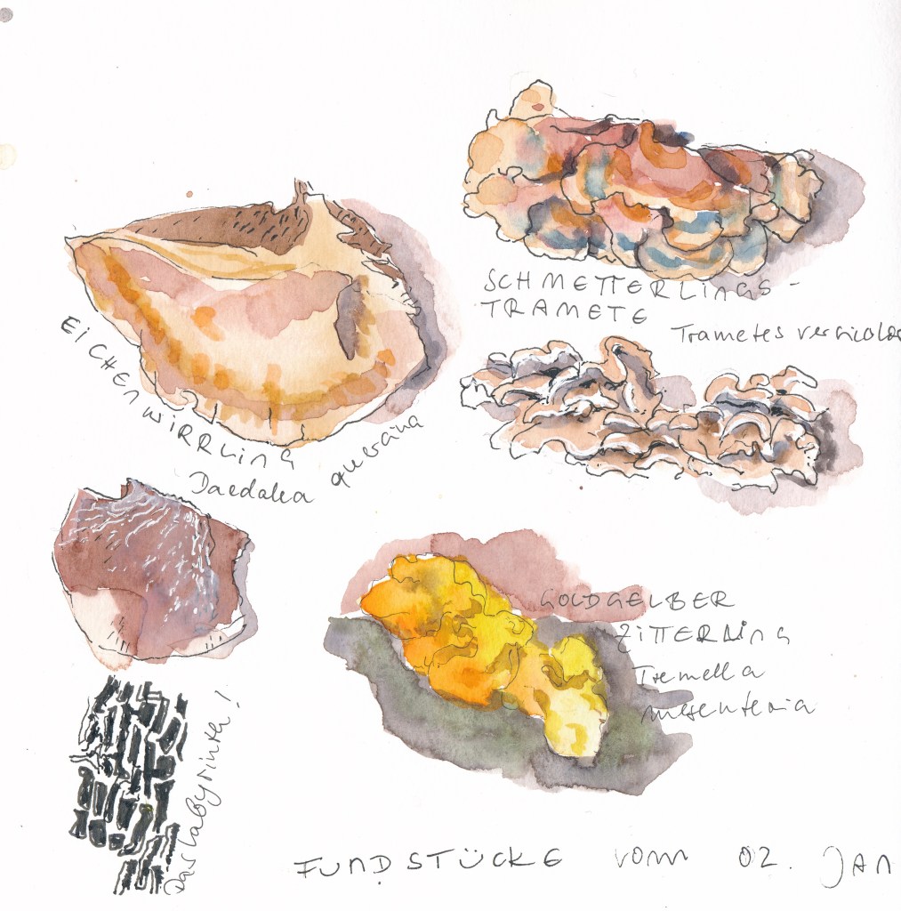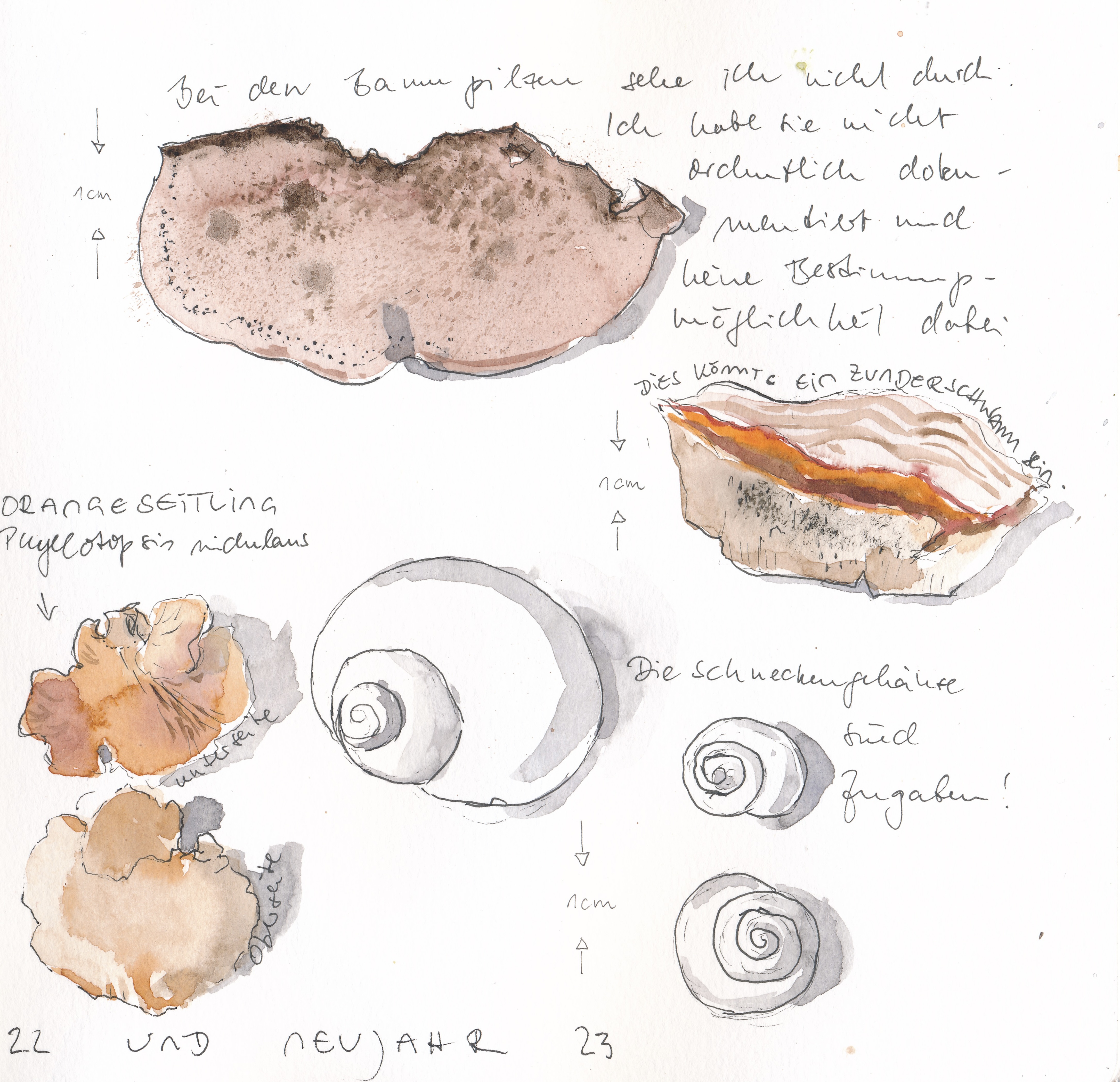 Veröffentlicht: 6. Januar 2023 Abgelegt unter: Botanische Malerei | Tags: Pilze Ein KommentarDen Jahreswechsel und ein paar Tage drumherum verbrachte ich in einem stillen Mecklenburger Dorf. Ich hatte Lust auf Naturstudien, auch reichlich Zeichenmaterial dabei. Gleich beim ersten Waldspaziergang leuchteten mir ein paar glänzende orangeocker Pilze entgegen: ich hatte mein Thema gefunden. Drei Tage lang sammelte ich die raren Exemplare ein, die der winterliche Wald bot, breitete sie auf dem Tisch aus, fotografierte und skizzierte sie. Meine Pilzbücher lagen zu Hause und meine Unterkunft im Funkloch; so konnte ich erst einmal nur den Bestand aufnehmen.