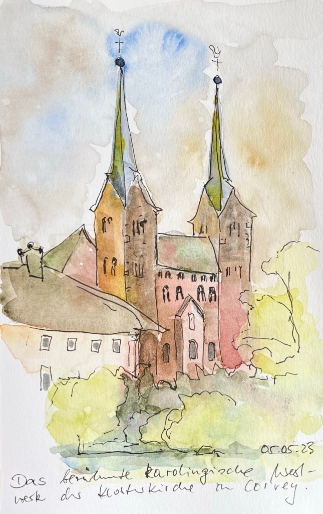 Veröffentlicht: 8. Mai 2023 Abgelegt unter: Allgemein, Reiseskizzen, Werra-Weser 2023 | Tags: Oberweser, Romanik Hinterlasse einen KommentarDie nächste Etappe führt nach Höxter. Und sie führt vor allem zur ehemaligen Klosteranlage in Corvey, die einen Welterbestatus zu bieten hat. Das in karolingischer Zeit gegründete Kloster war im Frühmittelalter ein Machtzentrum in sächsischem Gebiet gewesen, es beherbergte eine berühmte Bibliothek; im Laufe der Jahrhunderte verlor und gewann es mehrfach an Einfluss, bis es, bereits säkularisiert, im 19.Jahrhundert eine fürstliche Residenz wurde.
