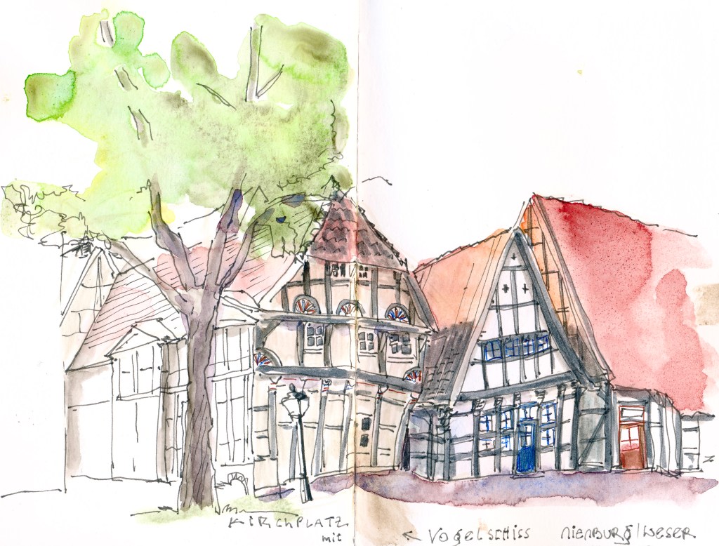 Nienburg, so erinnere ich mich, war die drittletzte Station. Aus meinem Hotel hatte ich einen malerischen Flussblick, unter dem Fenster rauschte ein alter Mühlbach; ich hätte dort sitzen bleiben mögen … Natürlich tat ich das nicht, sondern lief ein bisschen umher auf der Suche nach einem schönen Zeichenblick. Passende Bänke waren nicht zu haben, eine Bordsteinkante unter den Linden auf dem Kirchplatz bot sich als Kompromiss an: Das schiefe und sich gegenseitig stützende Fachwerk lockte.