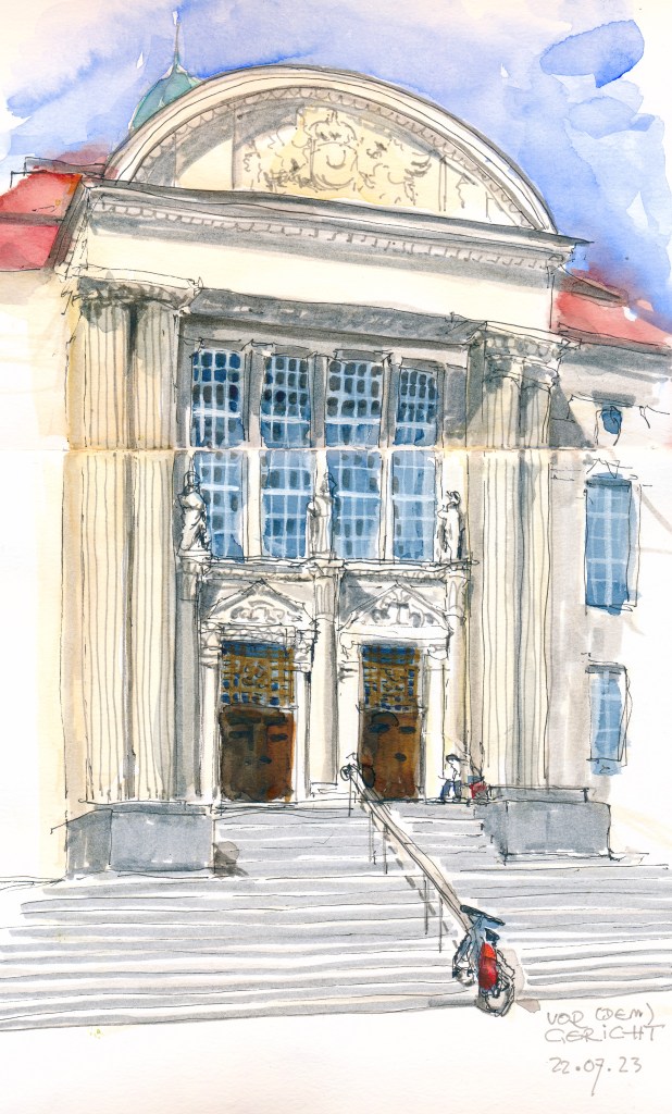 Veröffentlicht: 23. Juli 2023 Abgelegt unter: #uskschwerin, Architektur, Urban Sketching | Tags: Art Déco, DDR, Mecklenburg, Schwerin Hinterlasse einen KommentarDer Schweriner Demmlerplatz liegt am nördlichen Rand der heutigen Innenstadt. In früheren Jahrhunderten befand sich auf diesem Hügel die „Königsbreite“, ein Richtplatz, weit außerhalb der Altstadt. Mecklenburg industrialisierte sich langsam, entsprechend gemächlich vergrößerte sich die Stadt. In den fetten Jahren zwischen 1900 und dem Ersten Weltkrieg war der Stadtrand bis hier vorgerückt, mit hübschen bürgerlichen Häusern, und 1916 war das Gerichtsgebäude fertig geworden. Ein gewaltiger Kasten, stadtseitig zwischen Neoklassizismus und Art Déco – die Rückseite, die damals auf die Felder hinaus ging, gehörte zum Untersuchungsgefängnis und blieb entsprechend undekoriert.