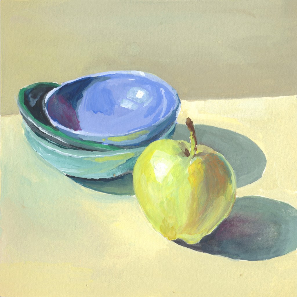 Veröffentlicht: 14. Juli 2024 Abgelegt unter: Alltag, visuelles Tagebuch | Tags: Bollhagen, Gouache, Obst, Stillleben 4 KommentareFrüher hießen sie Augustäpfel, dieses Jahr fielen die ersten – noch winzig, doch schon genießbar – Ende Juni vom Baum. Seit einer Woche gehe ich jeden Tag in den Garten und lese ein paar Hände voll auf, von Tag zu Tag werden sie größer und strahlen im schönsten Apfelgrün.