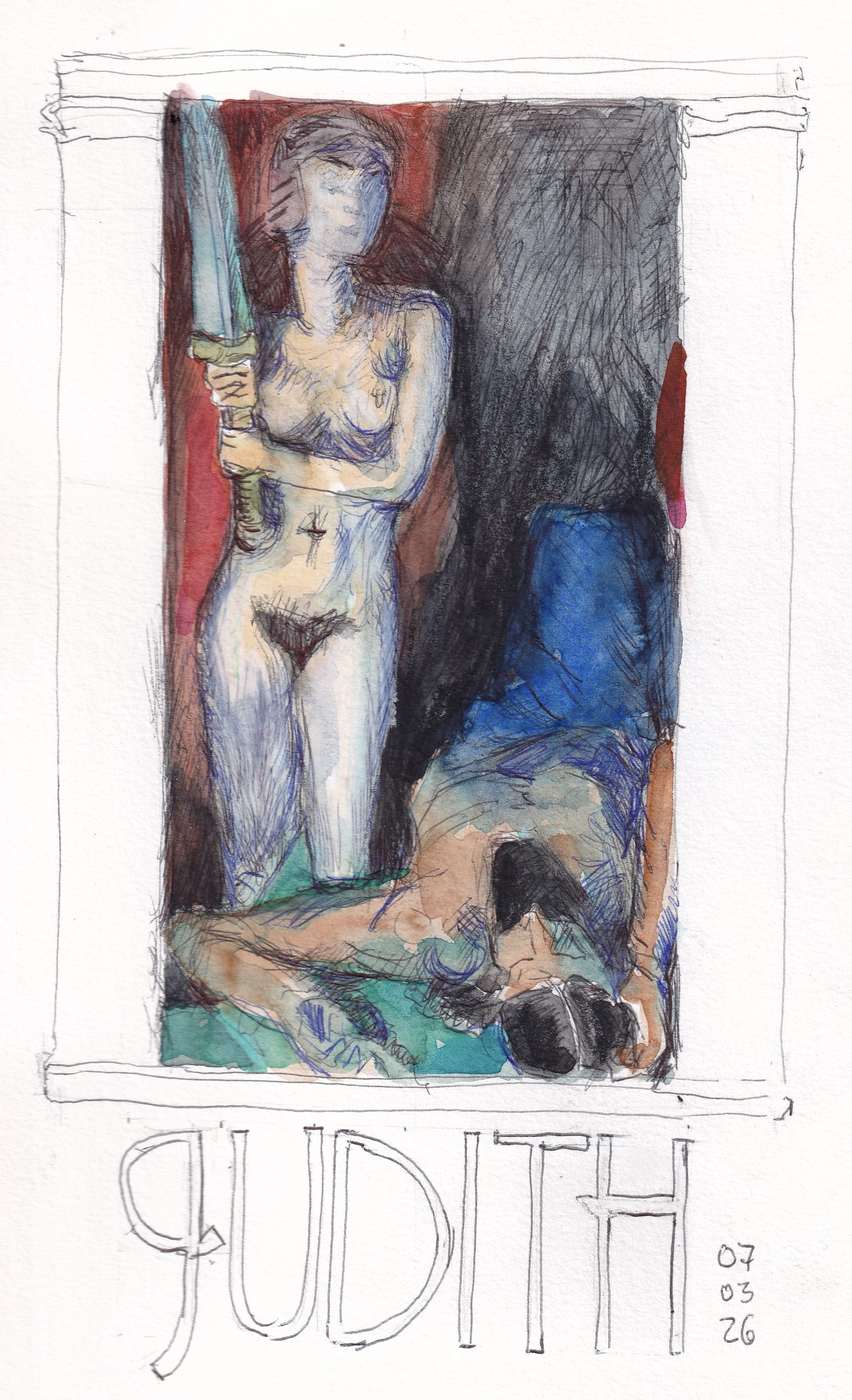 „Judith“, Franz von Stuck, 1927, abgezeichnet mit verschiedenen Kugelschreibern, Aquarell und etwas Buntstift