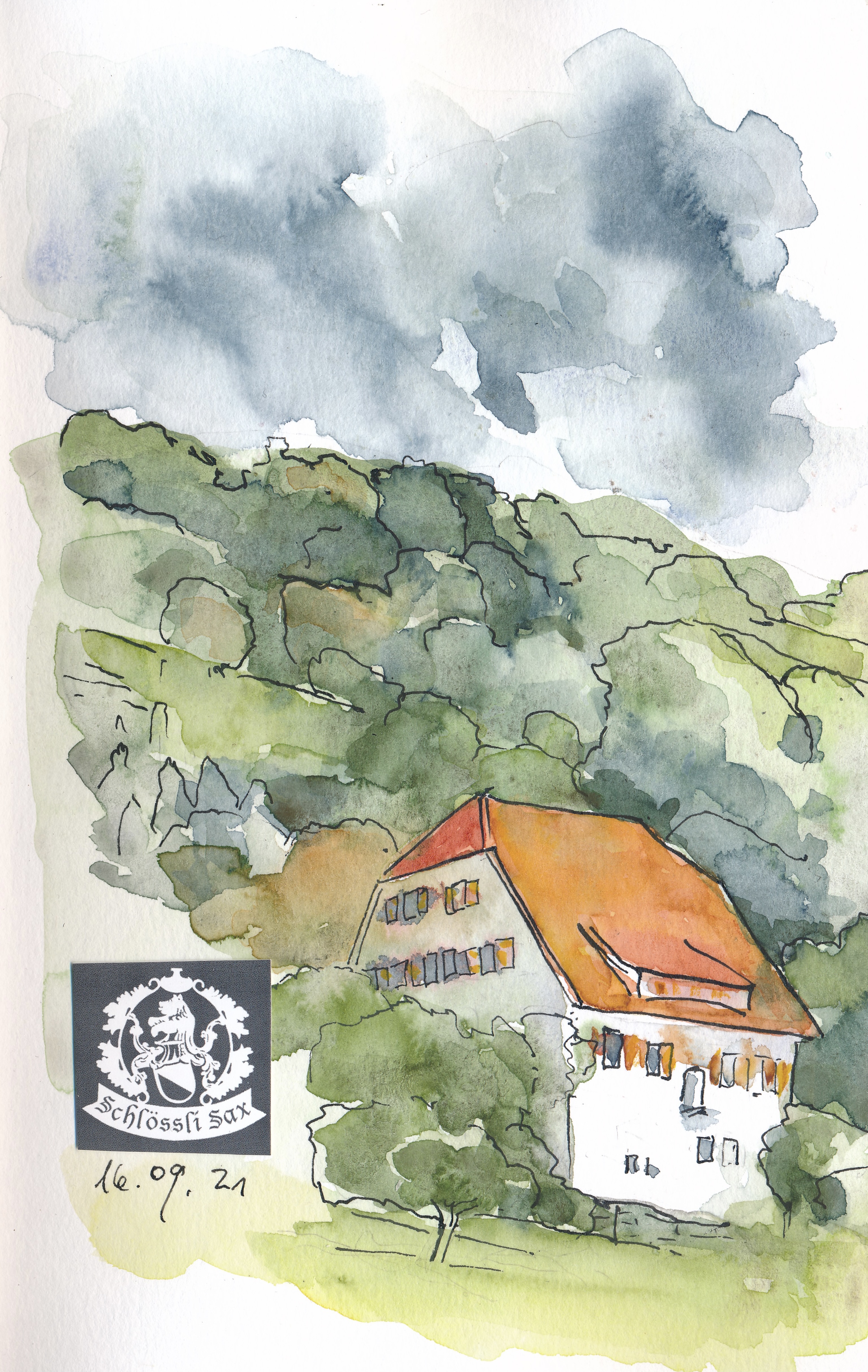 Die Schweiz ist bekanntlich kein preiswertes Reiseland – so habe ich meist in Privatzimmern übernachtet und mich aus dem Supermarkt verpflegt. An diesem Abend machte ich eine Ausnahme: ich speiste und schlief fürstlich hinter den dicken Mauern des „Schlössli“, eines echten Renaissance-Schlosses. Es ist ein wunderbarer Ort, dessen Bild man nicht ansieht, dass es leicht erhöht am Rand der Rheintalebene steht – man genießt einen wunderbaren weiten Blick. An dem verhangenen Morgen, an dem ich es mit ein paar Bleistiftstrichen skizzierte – alles andere kam später – sah man nicht, dass weit über ihm am Hang die Reste der Burg Hohensax zu sehen sind. Als ich ein wenig über das verzweigte Geschlecht derer von „Sax“ oder Hohensax“ nachlas, stellte ich erstaunt fest, dass sie in meinem Bücherschrank bereits eine Spur hinterlassen hatten. Im Freiburger „Wetzstein“ kaufte ich einst ein handsigniertes Exemplar von Adolf Muschgs Roman „Sax“ – den ich nie zu Ende gelesen habe, von dem ich nun aber immerhin weiß, wo der titelgebende Held seinen Stammsitz hatte.