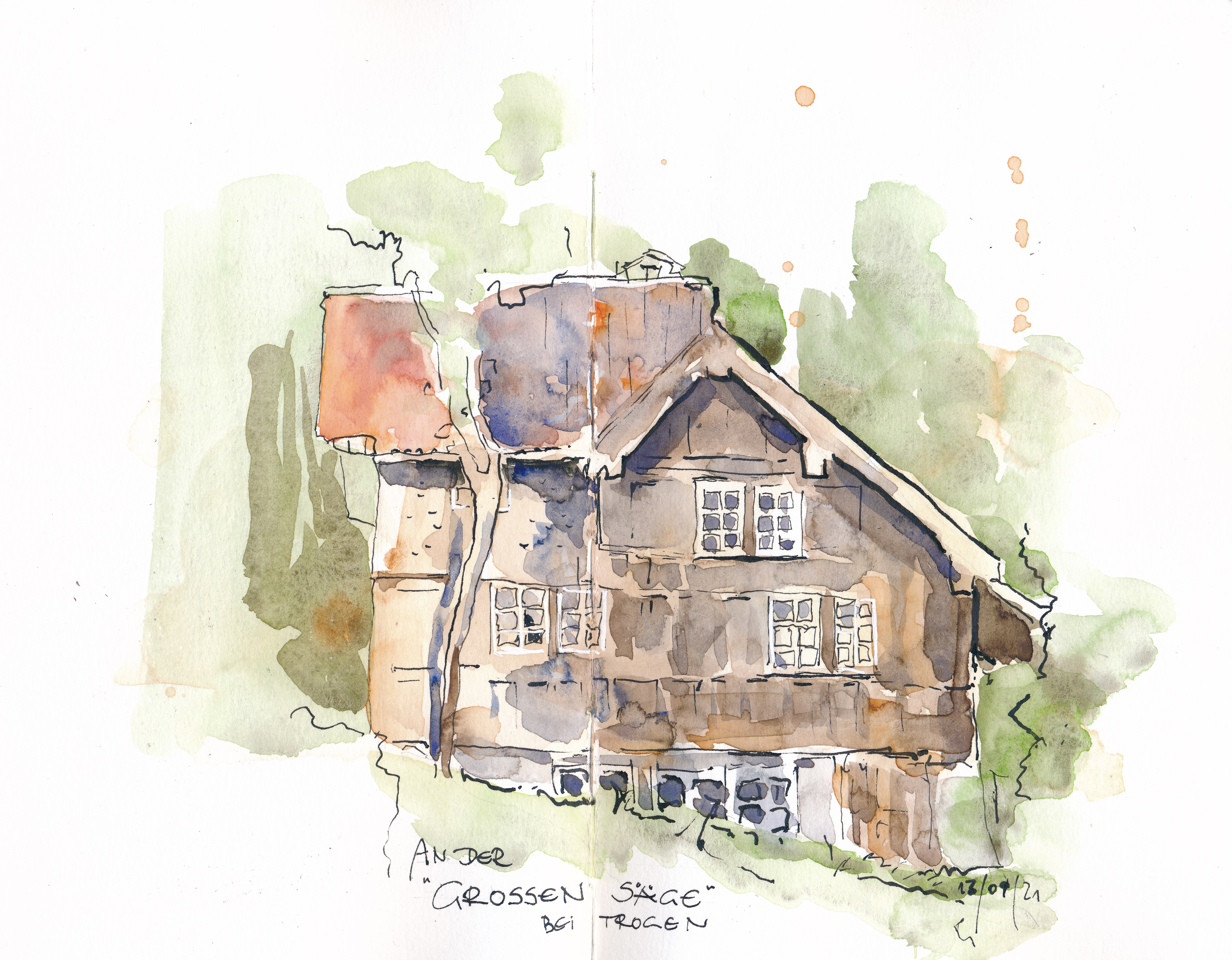 Veröffentlicht: 10. Oktober 2021 Abgelegt unter: Allgemein, Bewohntes Gelände 10, Reiseskizzen, Urban Sketching | Tags: Bodensee, Pilgerweg, Romanik Hinterlasse einen KommentarEinige Stunden des gestrigen, vorletzten Urlaubstages habe ich damit zugebracht, die Reisetagebücher zu sichten, unterwegs eingesammelte Erinnerungen einzukleben (oder wahlweise wegzuwerfen) und noch an das eine oder andere halbfertige Bild Hand anzulegen. Es war für mich selbst interessant zu sehen, wie weit weg die Erinnerungen der ersten beiden Wegwochen schon gerückt waren – anscheinend hat mein Gehirn nur einen bedingten Speicher für neue Eindrücke.