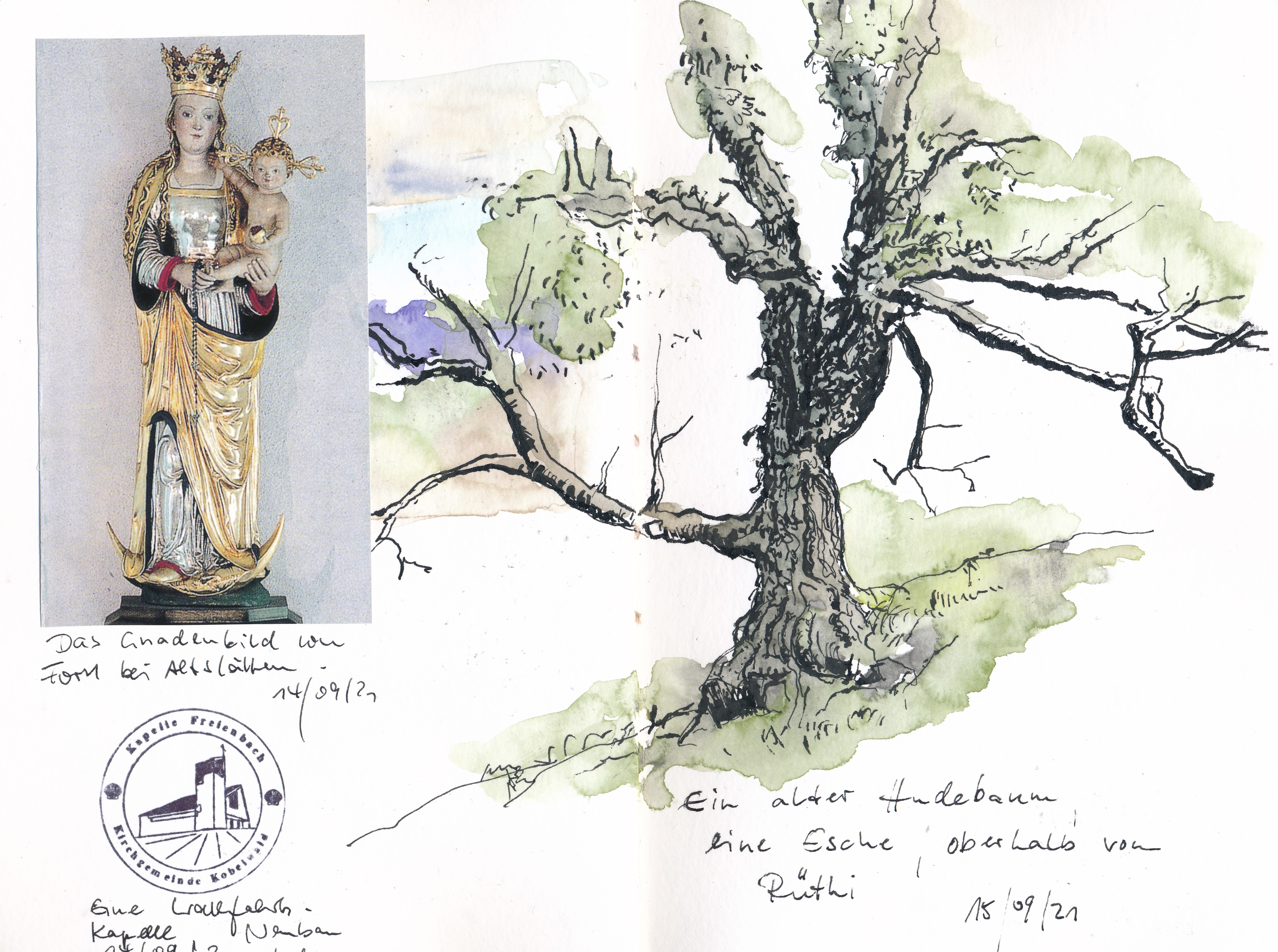 Am nächsten Tag wanderte ich über Berg und Tal und versuchte, endlich angekommen, noch die Skizze eines modernen Kirchleins gegen den Abendhimmel – sie misslang. Am nächsten Tag beschloss ich, dem Zeichnen seinen gebührenden Raum zu schaffen – und fuhr einen Teil der Strecke mit dem Bus. Der Lohn war u.a. das Bild einer alten Esche an einem Hang, über den Versuch des Vorabends gelegt. In der Zwischenzeit hatte sich noch ein Stempel der kleinen Wallfahrtskirche auf dem Blatt eingefunden – und zu Hause klebte ich das Bild einer hilfreichen Madonna dazu, deren Kirchlein komplett ungezeichnet geblieben war.