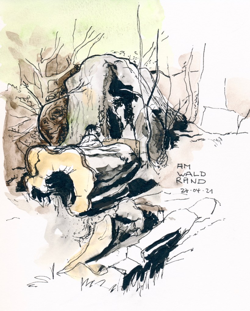 Nichts von alledem habe ich gezeichnet, jedenfalls dieses Mal nicht. Denn über der lieblichen Landschaft wehte im grellen Aprillicht ein scharfer Nordwind, der uns im Windschatten einiger frisch gerodeter Stubben rasten ließ. Der Blick fiel auf eine Wiese, die sich mit einer zügig den Hügel hinab weidenden Schafherde überzog – die sich, kaum hatte ich Papier und Stift herausgeholt, wie von Geisterhand hinter eine Bodenwelle zurückzog.