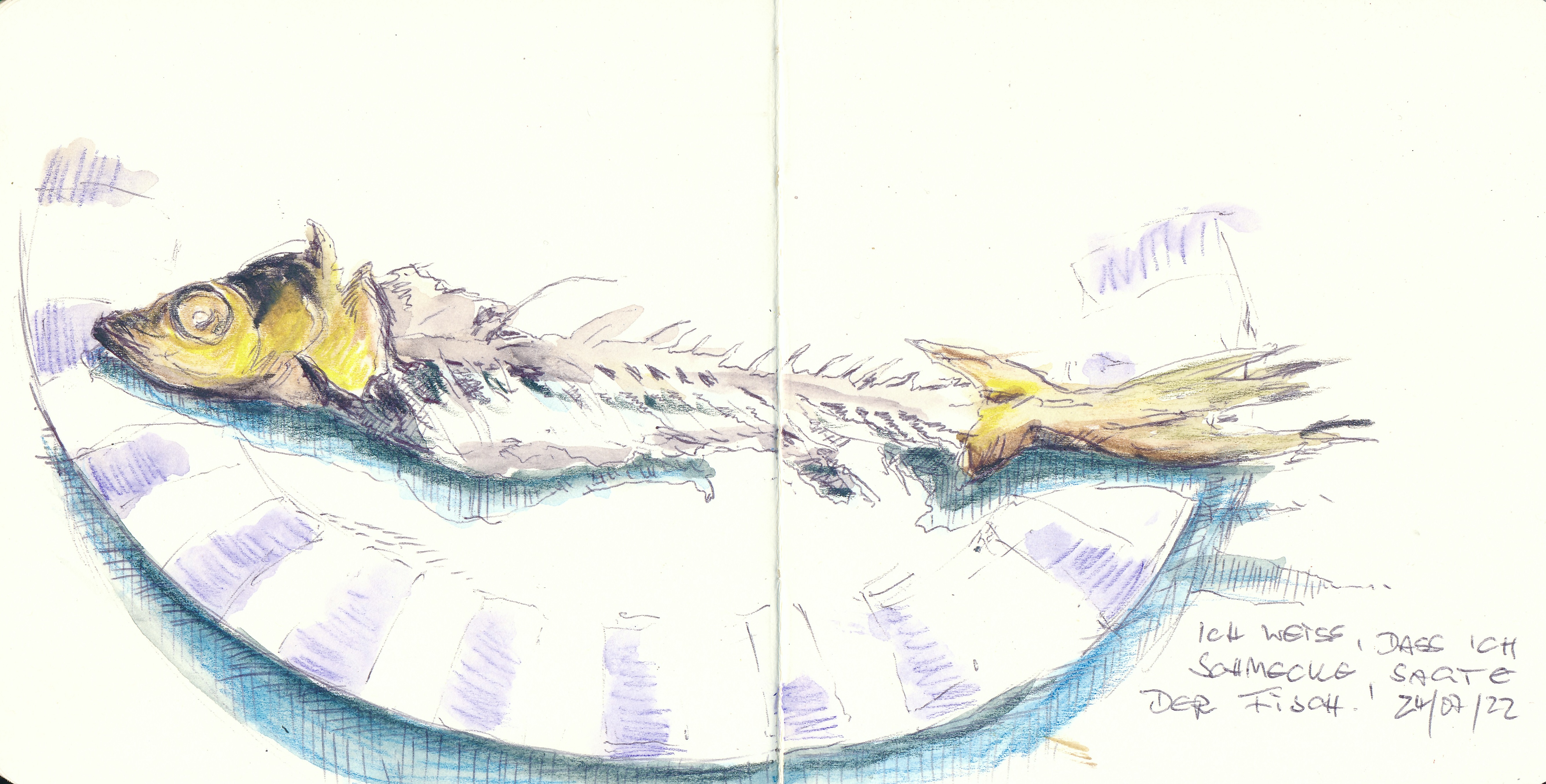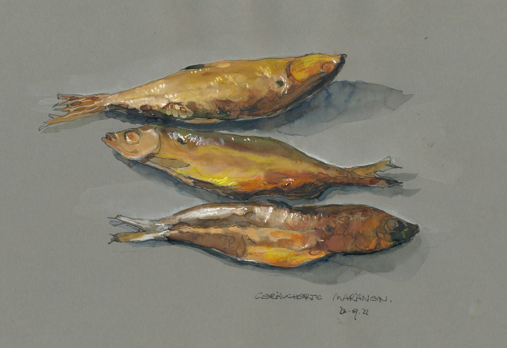 Veröffentlicht: 24. Juli 2022 Abgelegt unter: Alltag, Mixed Media, visuelles Tagebuch | Tags: Fisch, Maräne, Schwerin Hinterlasse einen KommentarMaränen habe ich schon ab und zu gezeichnet. Es sind heringsgroße Fische, die tiefe, kalte und saubere Süßwasserseen brauchen, besonders für das Wachstum der Jungfische. Ausgewachsene Exemplare sind nicht so empfindlich und schwärmen schon mal in die Ostsee aus. Fangsaison ist im Sommer, wenn es nicht zu warm wird. Und da die Feuerzungen der Große Hitze bisher nur kurz herübergelodert haben, gibt es noch welche. Sie sind sozusagen der Inbegriff von Regionalität. (Und sie scheinen sehr variable Gene zu haben, denn jeder große See, der auf sich hält, hat seine eigene Art. Anderswo heißen sie Felchen oder Renken, wobei der lokale Name nur locker mit dem wissenschaftlichen verknüpft ist. Diese hier haben „Coregonus albula“ in der Geburtsurkunde stehen.)
