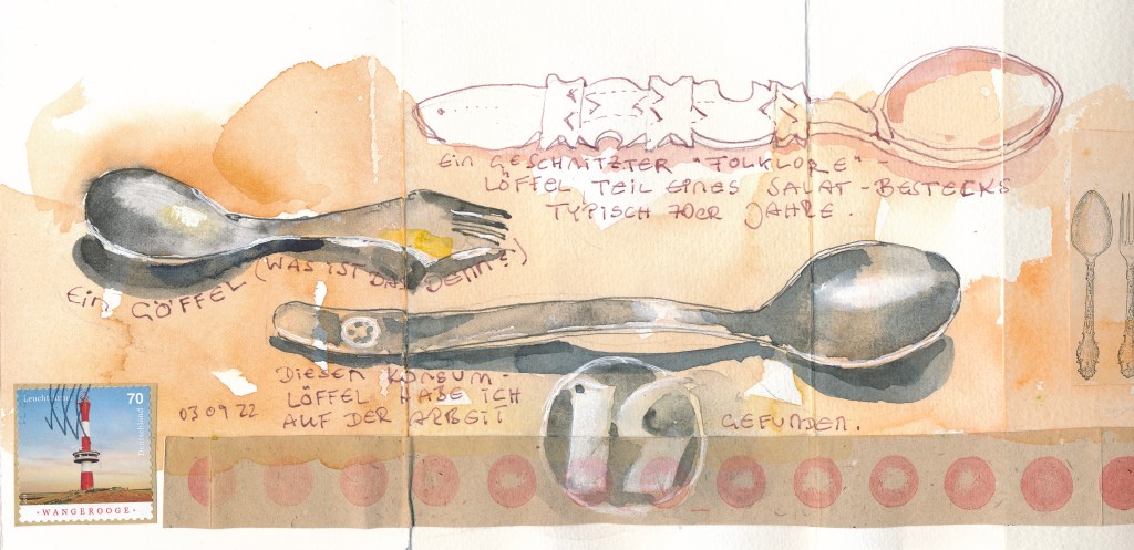 Als erstes schnitt ich eine kleine Skizze vom Mittagessen bei „Nordsee“ aus einem anderen Skizzenbuch aus und klebte sie ein – sie ist hier nicht zu sehen, nur der Leuchtturm kündet auf dieser Seite davon. Zu sehen sind drei besondere Löffel – am liebsten hätte ich „Eine kleine Geschichte von mir in sieben Löffeln“ erzählt und mich unendlich in den Assoziationen verloren, die die Dinge an unserer Seite auftun. Aber ich beschränkte mich erst einmal auf drei – mit Fortsetzungsoption.