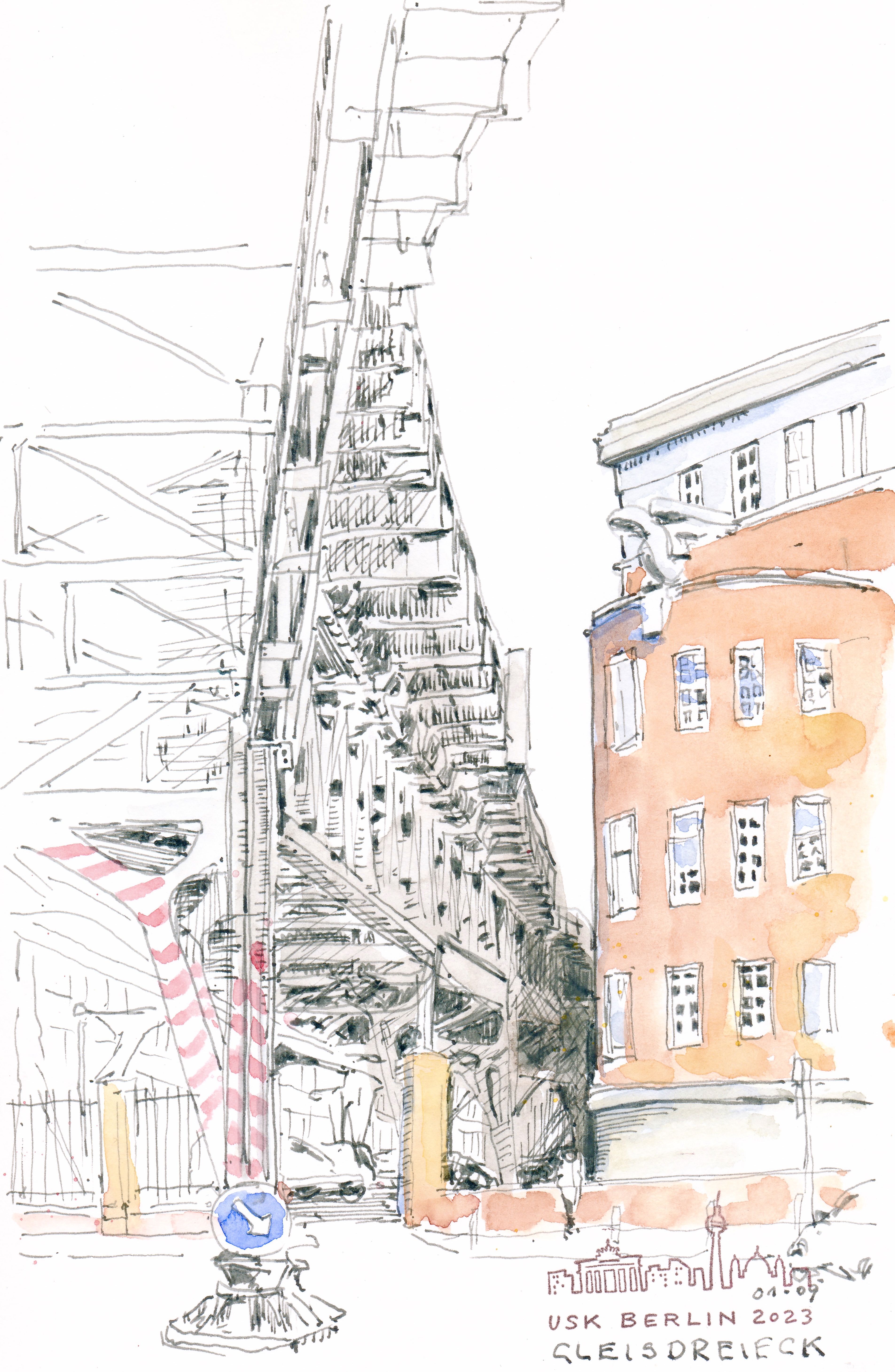 Veröffentlicht: 4. September 2023 Abgelegt unter: Mixed Media, Reiseskizzen, Urban Sketching | Tags: Bahnhof, Berlin, Urban Sketching Hinterlasse einen KommentarZeichnen macht glücklich, das wissen alle, die es gelegentlich praktizieren. Wie glücklich es macht, mit tausend anderen gemeinsam zu zeichnen, durfte ich am letzten Wochenende beim Deutschlandtreffen der Urban Sketchers in Berlin erleben. Die Bewegung der Urban Sketchers entstand 2007 in Seattle als Antwort auf die zunehmende Digitalisierung künstlerischen Arbeitens. Das wichtigste Grundprinzip ist das Zeichnen vor Ort als Gegenentwurf zum Arbeiten nach Fotografie – Authentizität. Die ersten Urban Sketchers waren Profikünstler, Gerichts- und Pressezeichner; bald entwickelte sich daraus eine weltweite Bewegung, an der auch viele künstlerische Laien teilhaben.