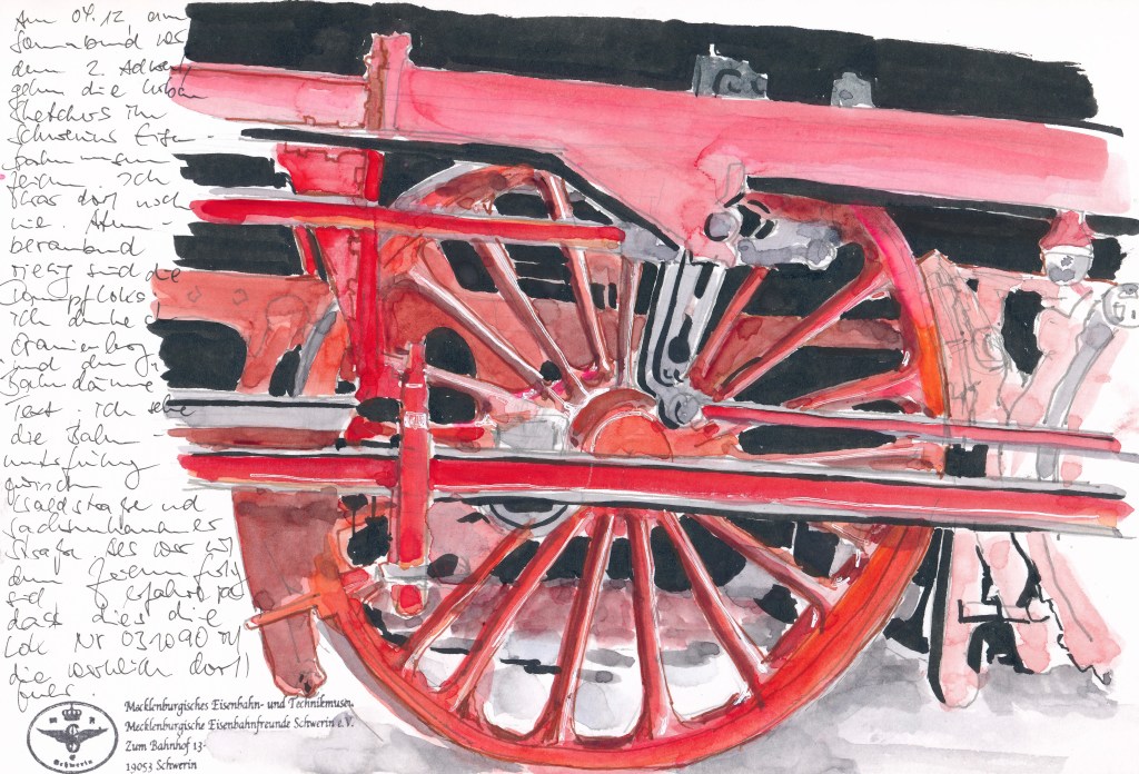 Veröffentlicht: 5. Dezember 2021 Abgelegt unter: #uskschwerin, Herkunft, Urban Sketching | Tags: 60er, Oranienburg, Schwerin, Zug fahren 3 KommentareDie Schweriner Urban Sketchers hatten nach einem Ort gesucht, wo sie vor Weihnachten noch einmal „unter Dach“ und dennoch an weitgehend frischer Luft zusammenkommen könnten – und waren beim Schweriner Eisenbahnmuseum fündig geworden. So saßen wir bald der schönsten aller Loks zu Füßen, einer riesigen Dampflok mit der Nummer 031090. Was fehlte, war der Geruch nach Kohlenrauch – die Loks in der Halle sind schon so lange außer Dienst, dass sich davon nichts mehr gehalten hat. Ein frisch befeuertes Kohleöfchen hätten wir auch genommen, denn es wurde bald empfindlich kalt, so dass selbst die hartnäckigsten Vor-Ort-Zeichnerinnen zu Hause koloriert haben.