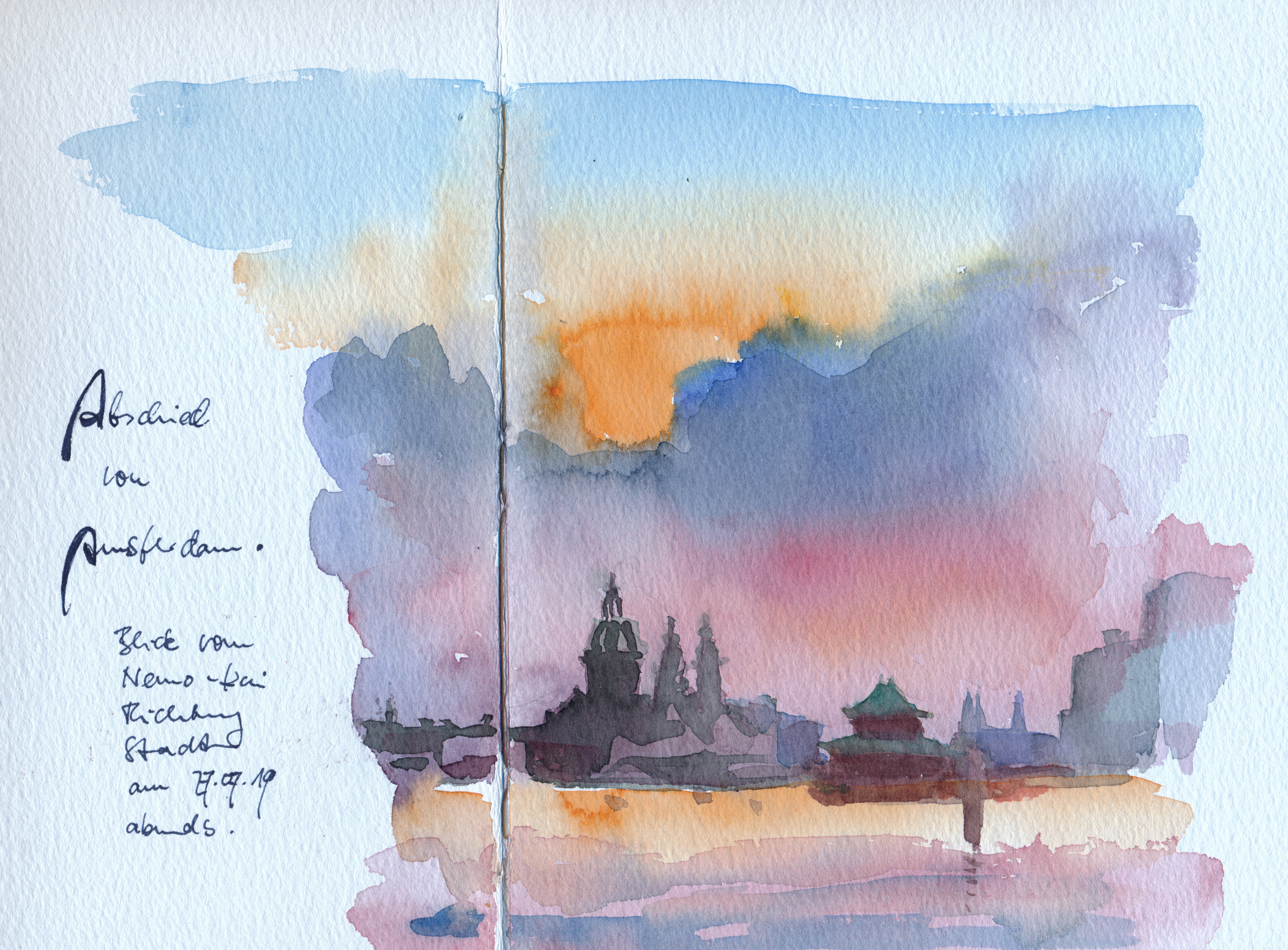 Veröffentlicht: 24. August 2019 Abgelegt unter: Allgemein, Amsterdam 2019, Ink&Wash, Reiseskizzen, Urban Sketching, visuelles Tagebuch | Tags: Amsterdam, Aquarell, visuelles Tagebuch Ein KommentarWer kennt das nicht: Eigentlich – schon das Wort, „eigentlich“ … eigentlich sollte es verboten werden – also eigentlich ist das Projekt fertig. Bis auf, nun ja, diese Kleinigkeit: zwei letzte Kisten müssen noch ausgepackt werden, die in der Mappe nach hinten gepackten Schriftstücke abgezeichnet und diese kaputte Glühbirne ausgewechselt … Und, es ist wie verhext, obwohl diese kleinen, unerledigten Dinge gar nicht wichtig sind, nichts von ihnen abhängt, so kleben sie uns an den Fersen und machen die nächsten Schritte schwer.